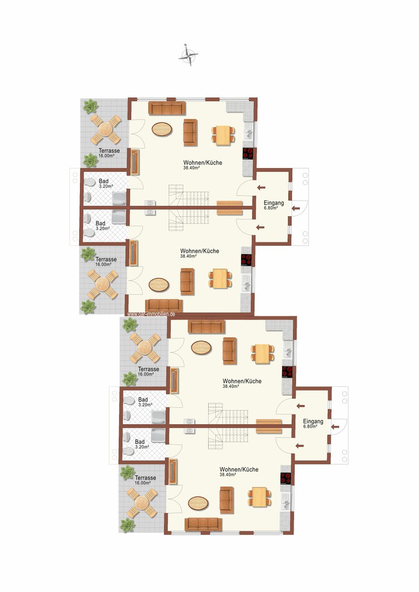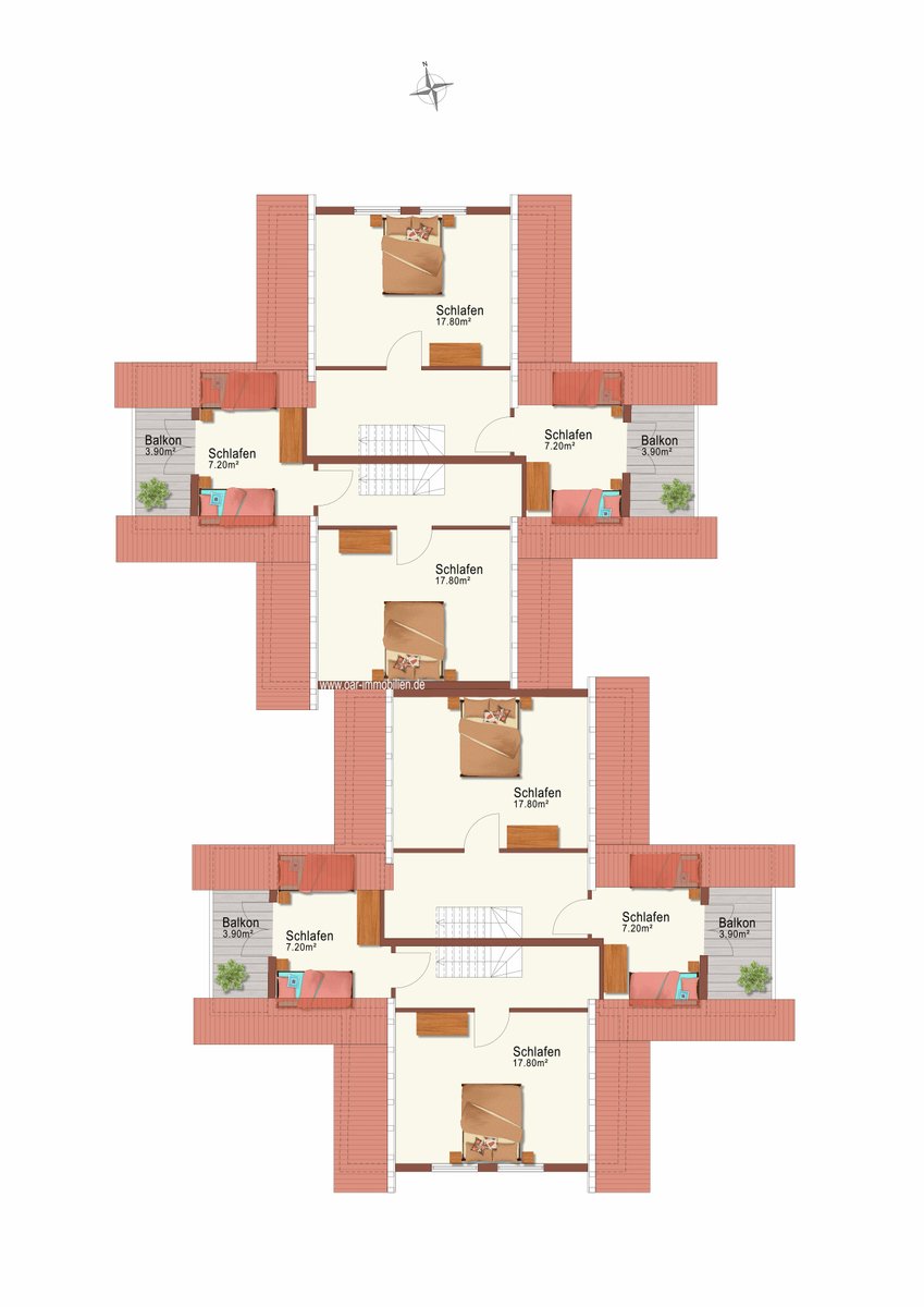 Jede der 4 Haushälften umfasst rund 83,2 m² Wohnfläche und erstreckt sich über zwei Ebenen. Das Interieur und die Grundausstattung unter offenen Holzbalken sind identisch: Im durchgehend gefliesten Erdgeschoss befindet sich der großzügige Wohn- und Essbereich mit Zugang zur ca. 16 m² große Terrasse in Westausrichtung. Die integrierte, 2020 in allen 4 Wohnungen erneuerte Küchenzeile verfügt über Cerankochfeld, Waschmaschine, Kühlschrank mit Gefrierfach, Spülmaschine, Mikrowelle und diverses Kleininventar. Ebenfalls im Erdgeschoss befindet sich das Duschbad mit Handtuchheizkörper. Im mit Dielen ausgelegten Obergeschoss befinden sich zwei Schlafzimmer - eines mit Doppelbett und zusätzlichem TV, ein weiteres mit zwei Einzelbetten und Zugang zum 3,9 m² großen Balkon. Auf dem 1057 m² großen, umzäunten Grundstück befinden sich weiterhin ein 2023 gebautes, ca. 13 m² großes Saunahaus, 4 PKW-Außenstellplätze und ein 2025 angelegter Grillplatz mit Steingutgrill. Die 4 Haushälften werden seit Fertigstellung im Jahr 2005 als haustierfreie Nichtraucher-Ferienwohnungen vermietet. Es erfolgt kein Einzelverkauf der Wohnungen oder Häuser.