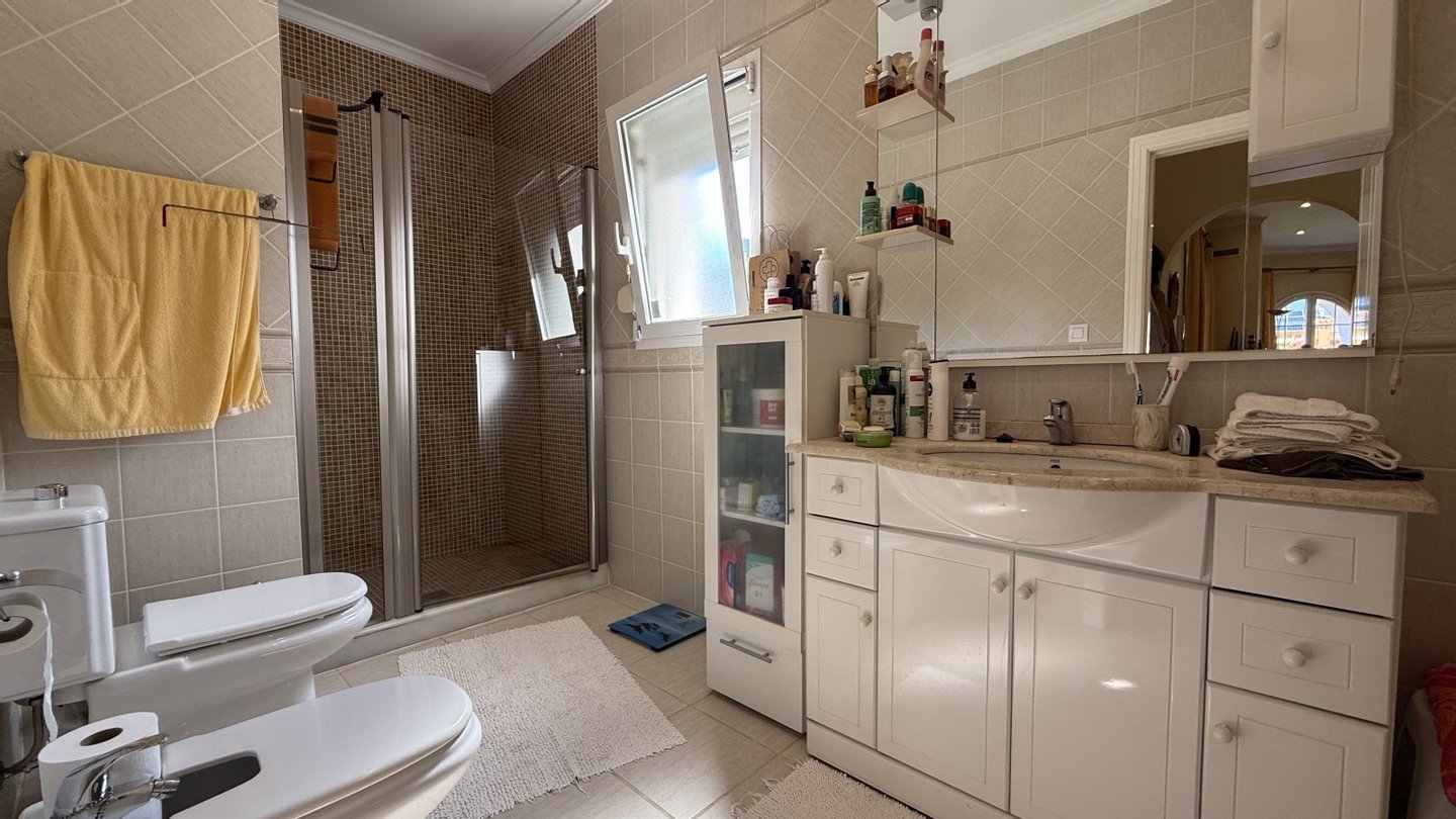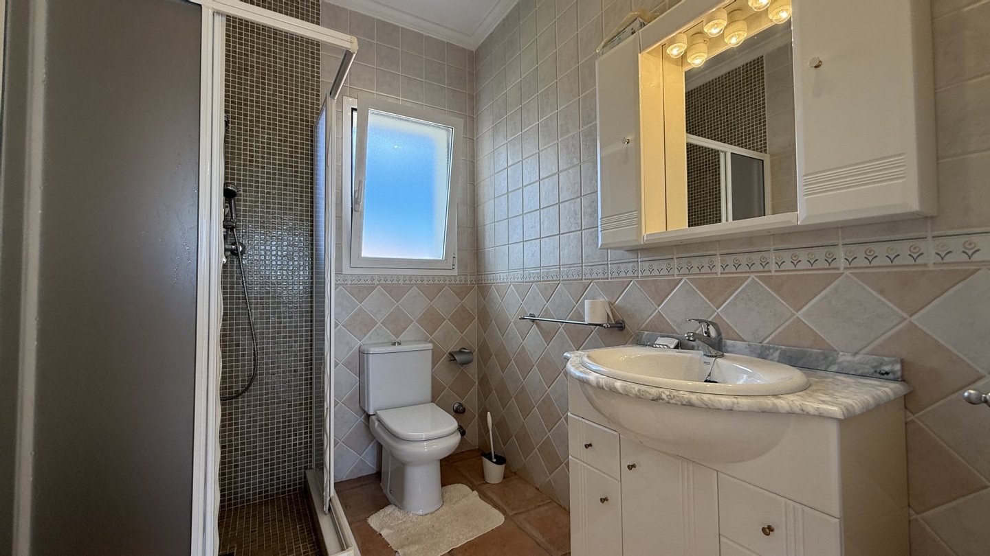 Die Wohnfläche verteilt sich auf zwei Ebenen. Im Erdgeschoss befinden sich zwei Schlafzimmer, ein Badezimmer, eine Küche mit angrenzender Waschküche sowie ein gemütliches Wohn- und Esszimmer, das durch einen Wintergarten erweitert wird und so auch in den kühleren Monaten viel Licht und Behaglichkeit bietet. Über eine Außentreppe gelangt man ins Obergeschoss, wo ein separater Bereich mit einem weiteren Schlafzimmer, eigenem Bad und einer kleinen Küchenzeile liegt. Dieser Bereich eignet sich ideal für Gäste oder unabhängiges Wohnen. Von der großzügigen Dachterrasse aus eröffnet sich ein beeindruckender Ausblick auf die umliegenden Berge und die Burg von Dénia.