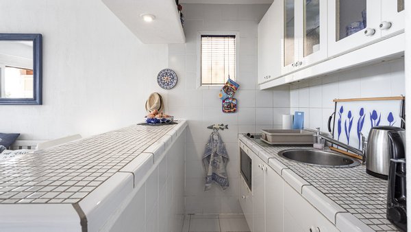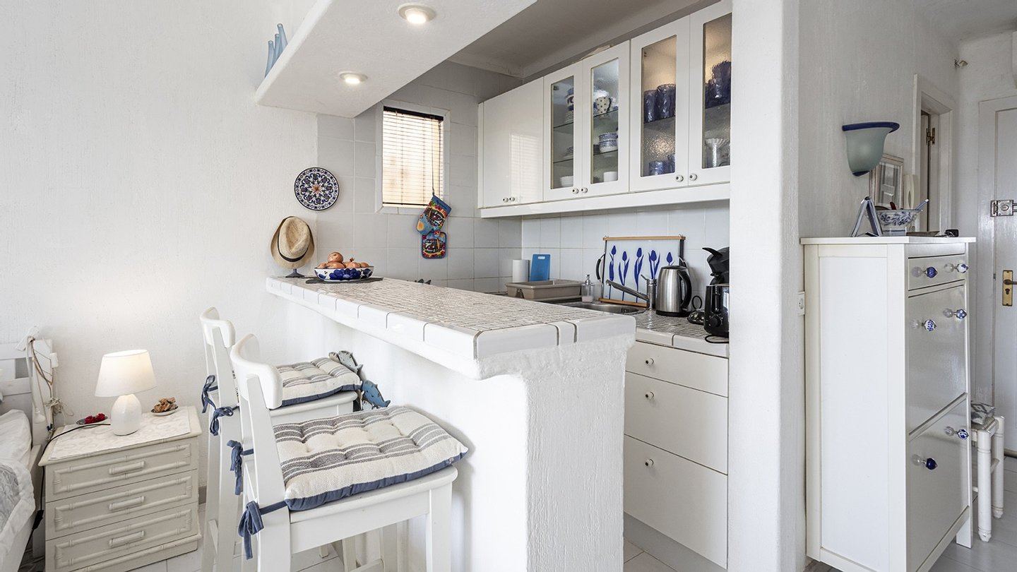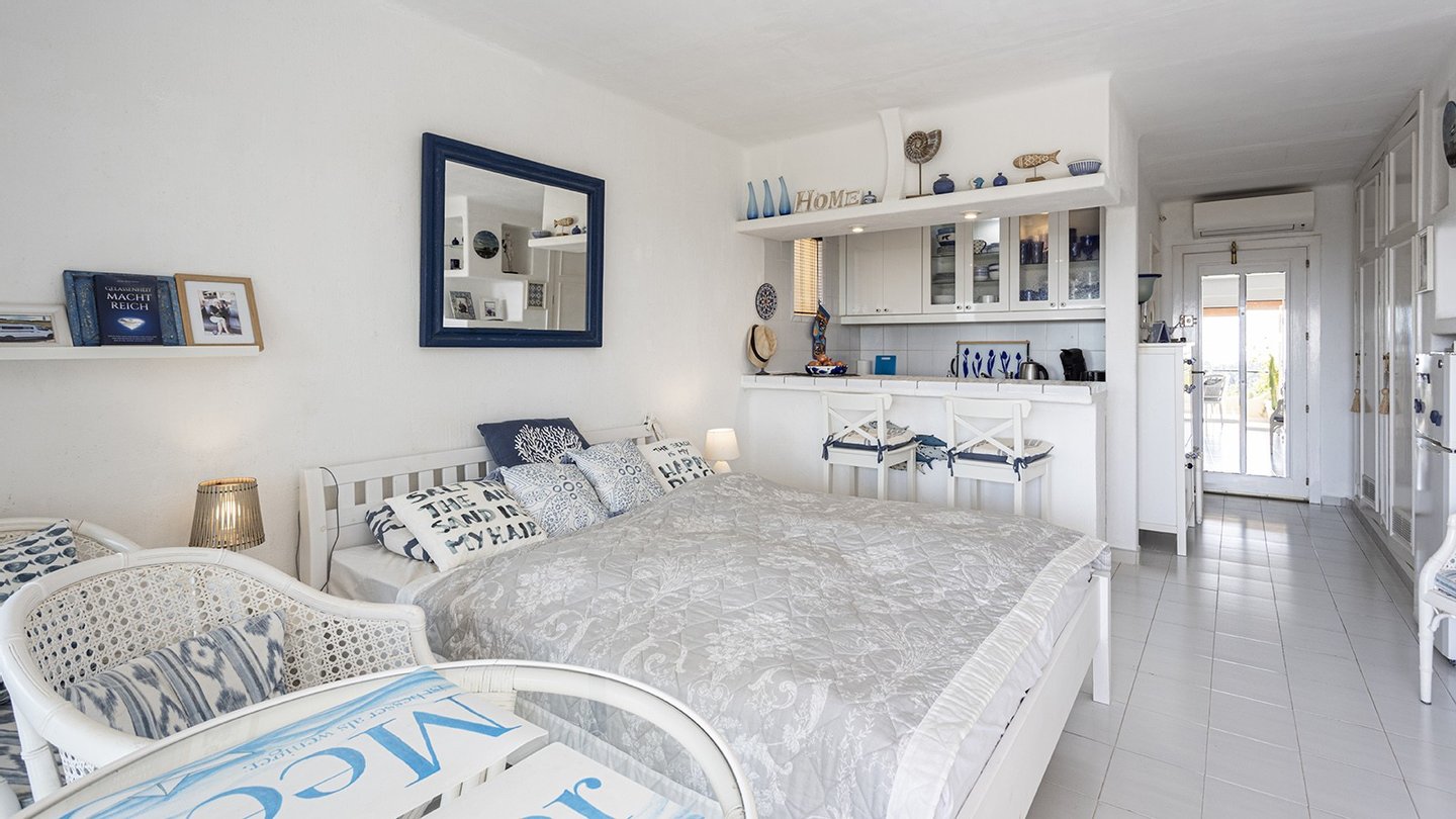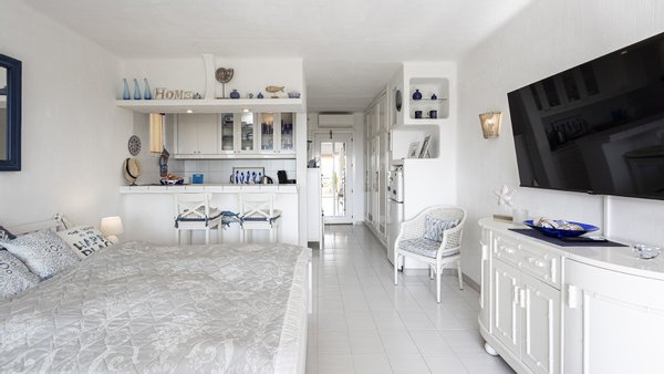 Die gepflegte Immobilie bietet eine Wohnfläche von ca. 32 m2 zzgl. einer ca. 11 m2  überdachten Terrasse. Die Wohnung teilt sich auf in einen hellen Wohn-/Schlafbereich, eine offene Einbauküche, ein Badezimmer sowie einen separaten Abstellraum. Die Immobilie eignet sich ideal als Feriendomizil oder Wochenendwohnung und ist aufgrund der Nähe zum Flughafen optimal erreichbar. Weitere wichtige Ausstattungsmerkmale sind: Fliesenboden, doppelverglaste PVC-Fenster, Gegensprechanlage, SAT-TV und Telefonanschluss. Von der überdachten Terrasse aus hat man einen spektakulären Blick auf die Berge, die Grünzone und das Meer. Die Wohnung ist gepflegt und mit mediterranen Elementen eingerichtet. Der Gemeinschaftspool mit Sonnenterrasse bietet zusätzliche Erholungsmöglichkeiten. Ein PKW-Stellplatz in der Anlage ist ebenfalls dem Apartment zugeteilt.