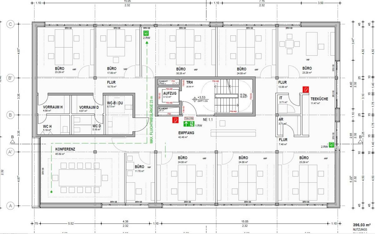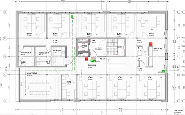 Die größeren Büro- u. Besprechnungsräume sind mit Akustiksegeln unter der Decke ausgestattet, die störungsfreies Arbeiten, auch von mehreren Mitarbeitern, im gleichen Büro sicherstellen.