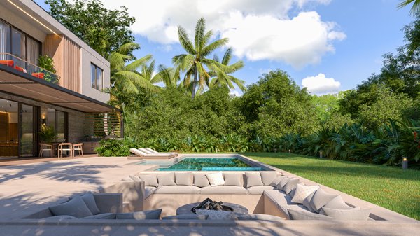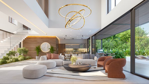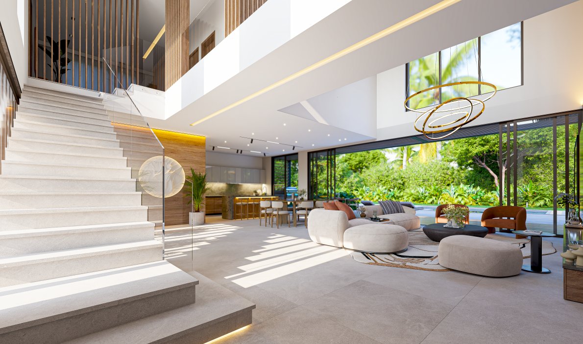 Die erste Ebene begrüßt Sie mit weitläufigen Gemeinschaftsbereichen und dramatischen doppelhohen Decken, die den Blick auf den Pool und die Gärten einrahmen. Eine überdachte Terrasse mit eingebautem Grill und Außenküche erweitert den Wohnraum im Freien, ergänzt durch einen beheizten Whirlpool, eine versunkene Lounge und ein Hauptschlafzimmer mit begehbarem Kleiderschrank und eigenem Bad. Auf der Ebene befinden sich auch eine formelle Küche mit Frühstücksecke, eine separate Serviceküche, ein Waschbereich, ein Dienstmädchenquartier, ein Gästebad und Parkplätze für vier Fahrzeuge.