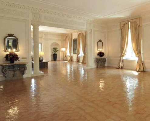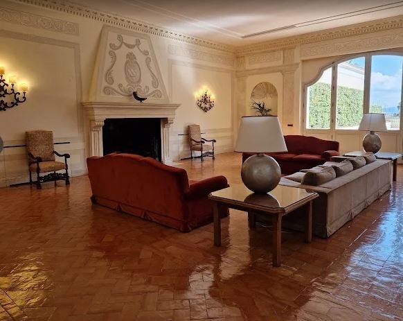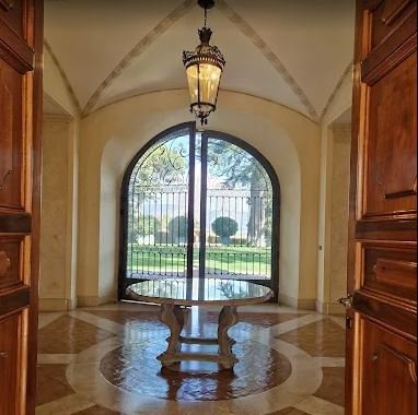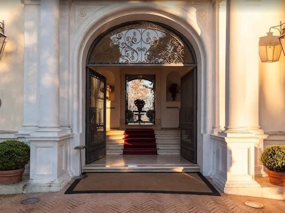 Eine Treppe führt zum Eingang mit einem großen Anbau und Wohnzimmer, das sich nach Norden öffnet und durch das Arbeitszimmer, die Bibliothek und die alte Wohnung gekennzeichnet ist. Die Südseite verfügt über zwei luxuriöse Hallen von 500 Quadratmetern, die auf eine Außenterrasse von über 300 Quadratmetern mit Blick auf die Castelli Romani, Tivoli und die Tiburtini-Berge führen.