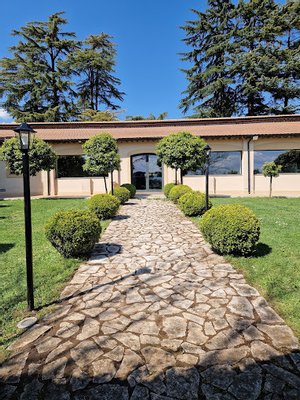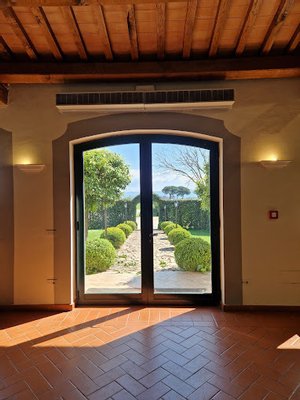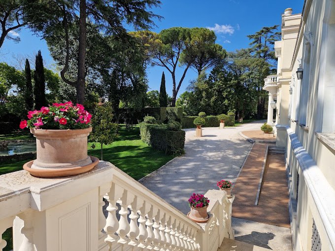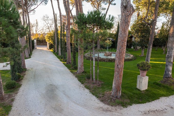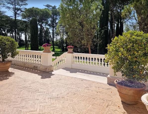 Eine Treppe führt zum Eingang mit einem großen Anbau und Wohnzimmer, das sich nach Norden öffnet und durch das Arbeitszimmer, die Bibliothek und die alte Wohnung gekennzeichnet ist. Die Südseite verfügt über zwei luxuriöse Hallen von 500 Quadratmetern, die auf eine Außenterrasse von über 300 Quadratmetern mit Blick auf die Castelli Romani, Tivoli und die Tiburtini-Berge führen.