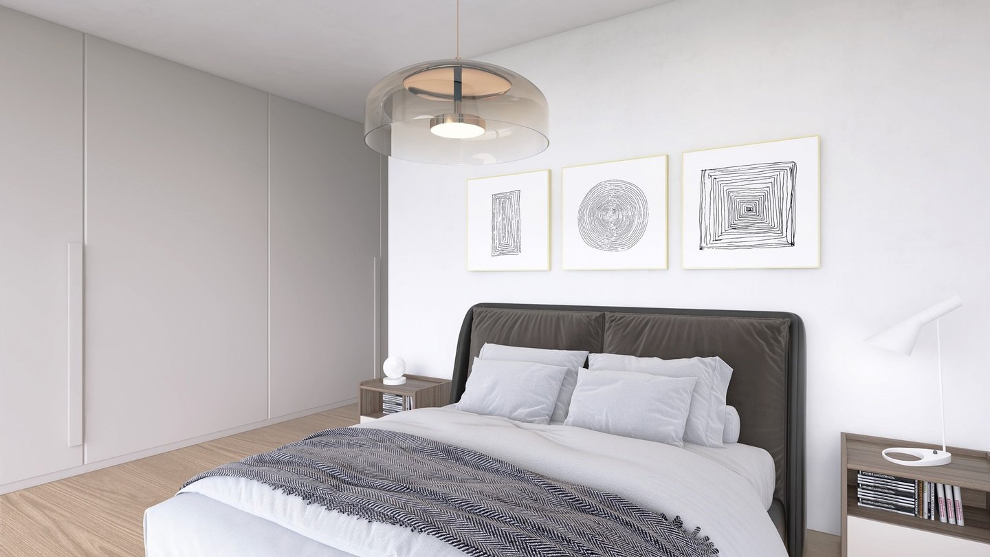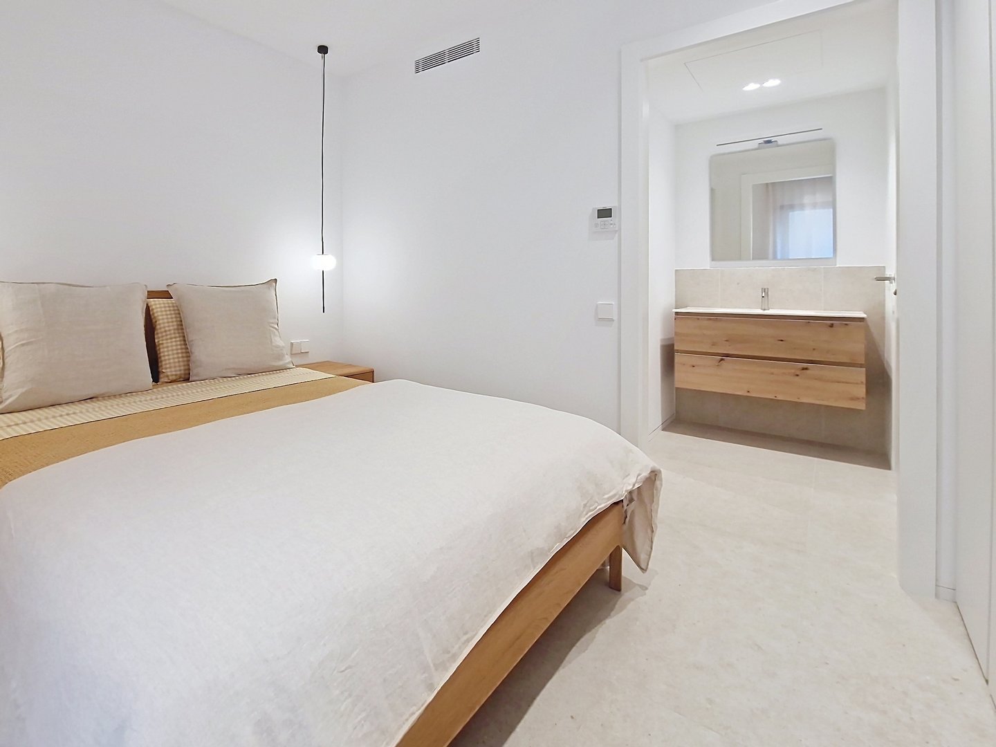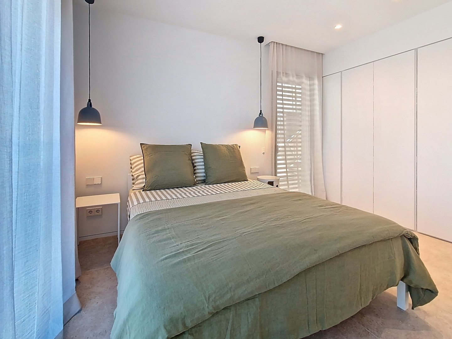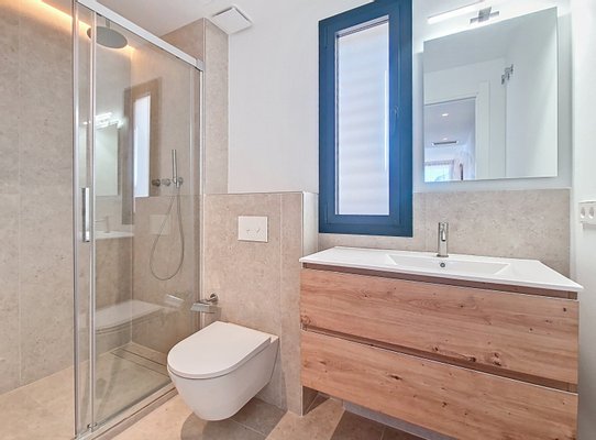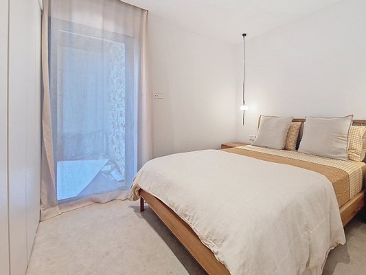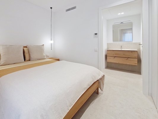 The bright and functional interiors boast a minimalist design, inviting comfort and relaxation. The three exterior bedrooms, each with an en-suite bathroom and direct access to the garden, provide a perfect retreat to unwind.