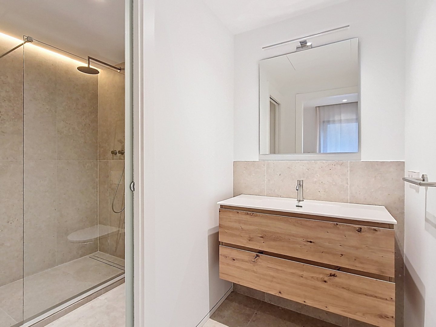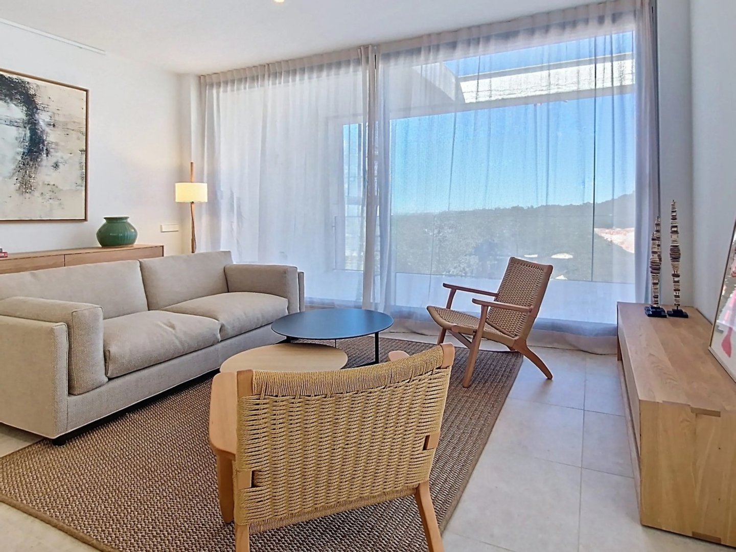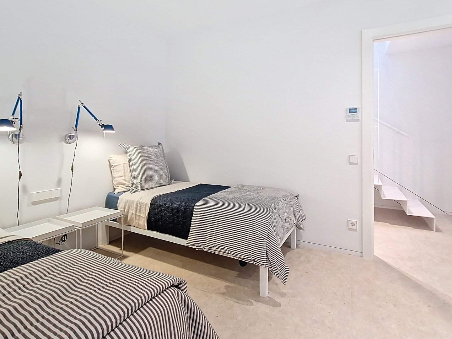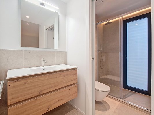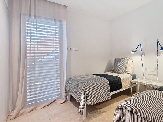 The bright and functional interiors boast a minimalist design, inviting comfort and relaxation. The three exterior bedrooms, each with an en-suite bathroom and direct access to the garden, provide a perfect retreat to unwind.