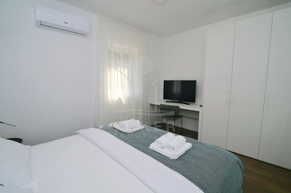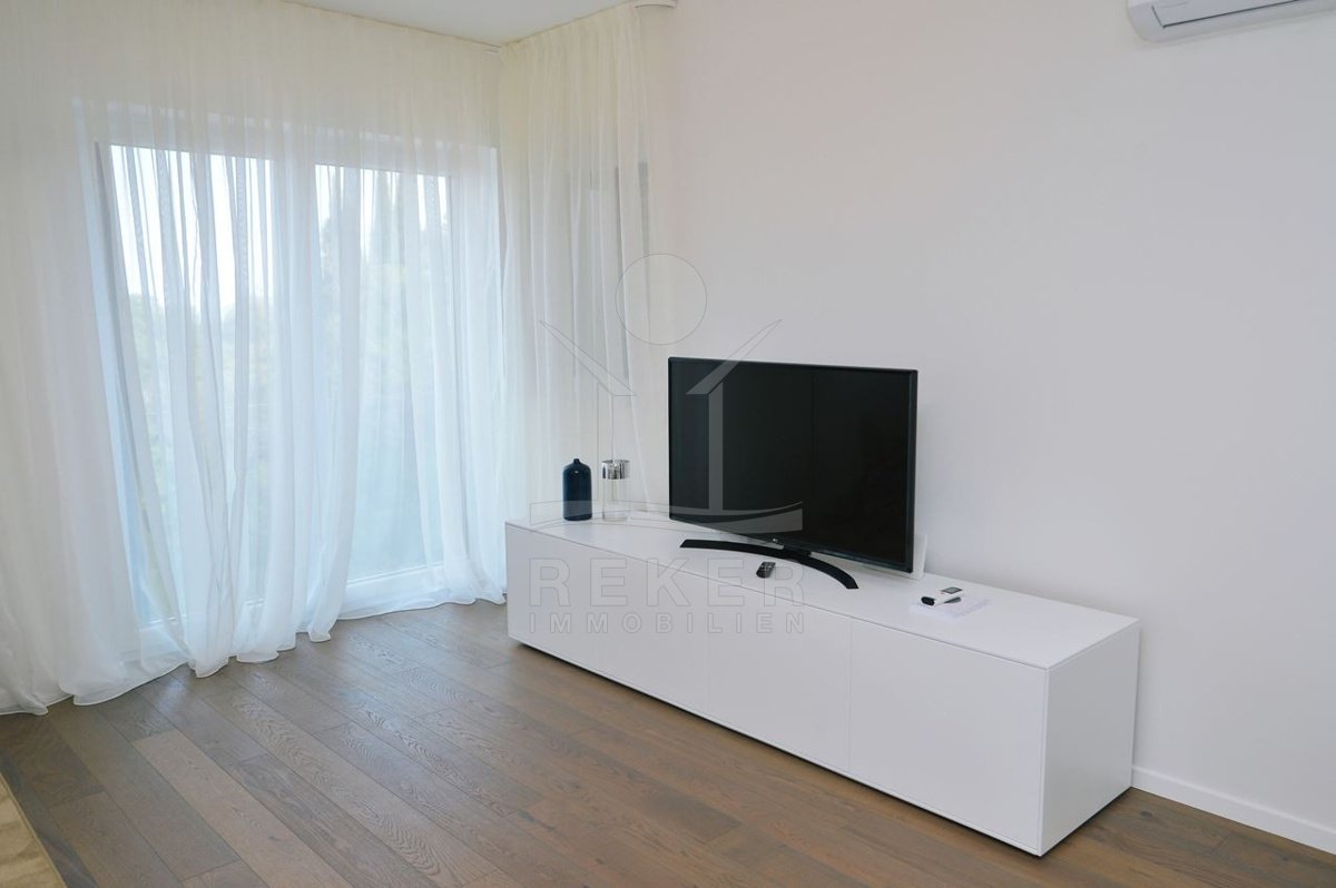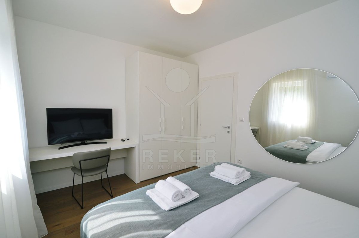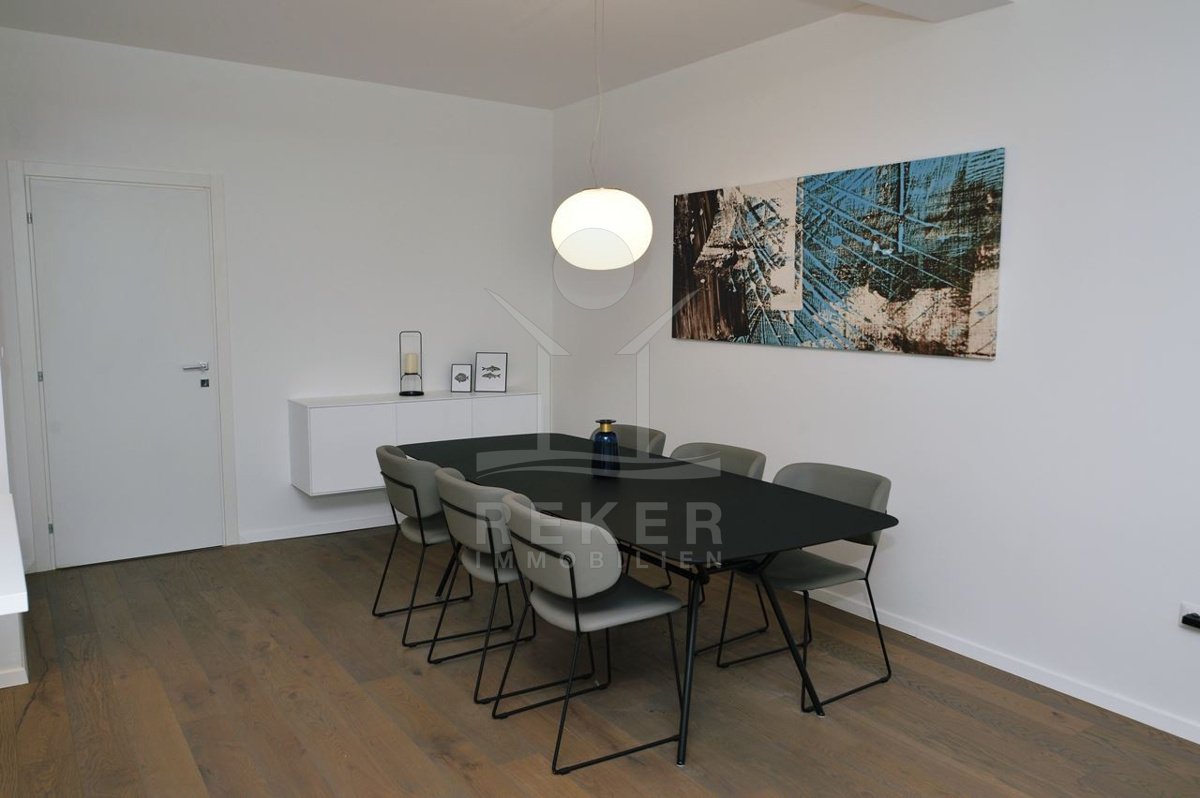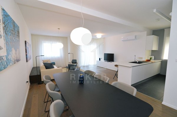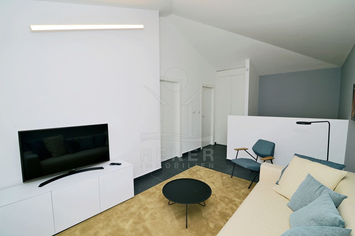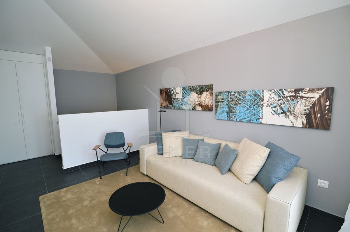 Ein Zuhause, das Weite atmet: Über zwei Ebenen spannt sich moderner Wohnkomfort mit Panoramablick über die Adria. 29 m² Terrasse, Designküche, zwei Bäder – und das Gefühl, angekommen zu sein.