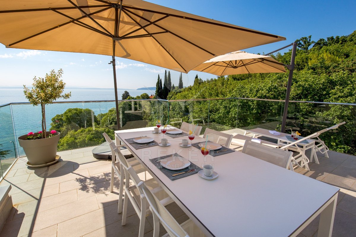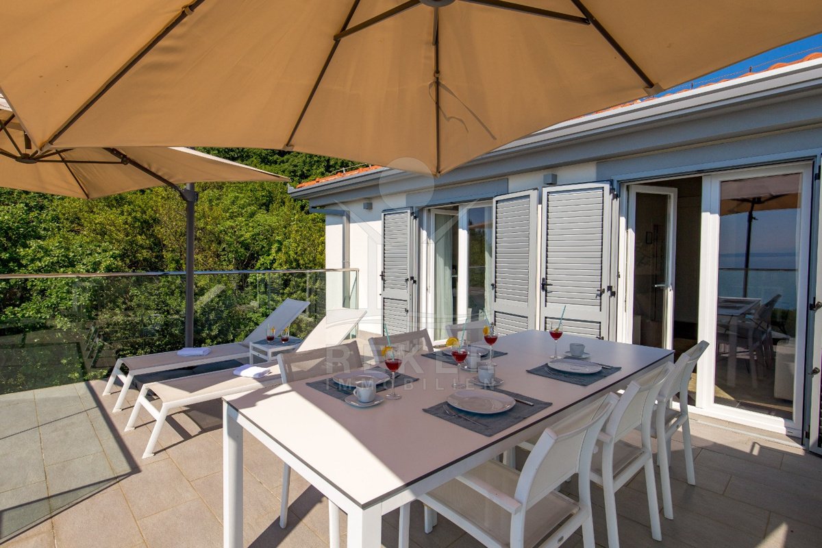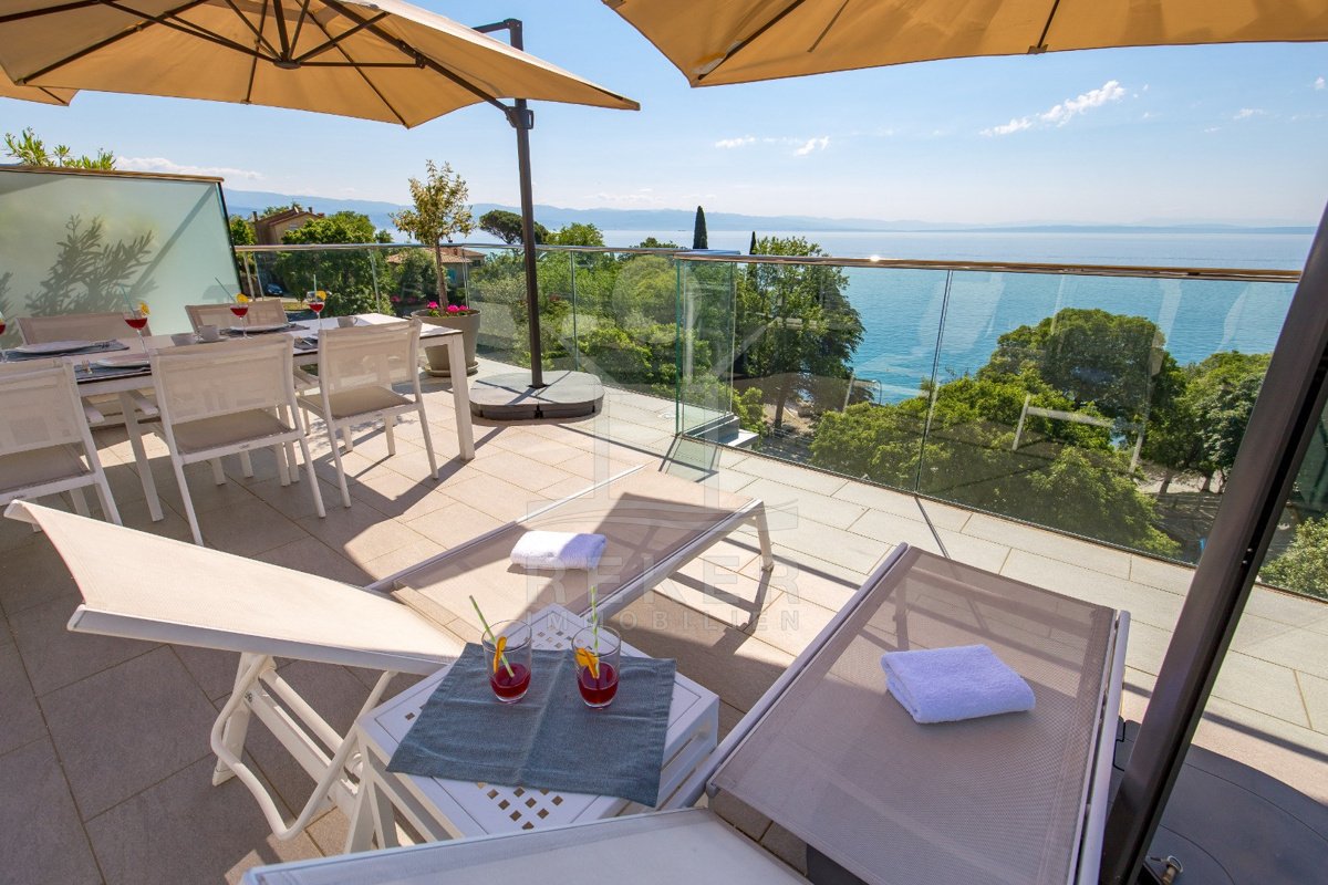 Nur ein paar Kilometer von Opatija entfernt liegt diese moderne Villa … direkt an der Küste, nur 50 Meter vom Meer. Dank ihrer Lage am Hang haben Sie freien Blick auf die Adria, ganz ohne störende Bebauung davor. Und weil rundherum dichter