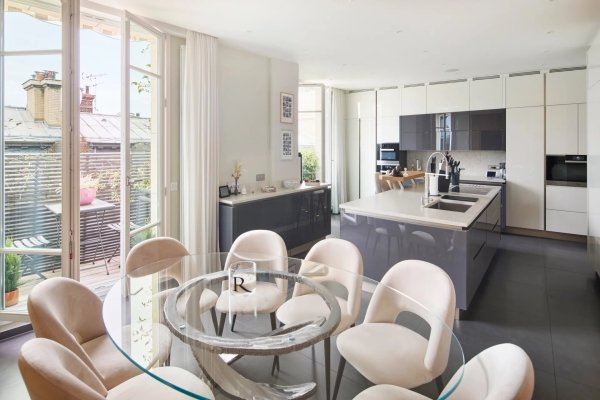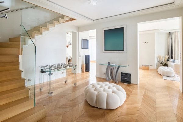 In einem schönen haussmannschen Gebäude, im 6. und 7. (obersten Stock) mit Aufzug, befindet sich ein prächtiges 332 m² großes Doppelhaus, umgeben von Balkonen mit offenem Blick, bestehend: