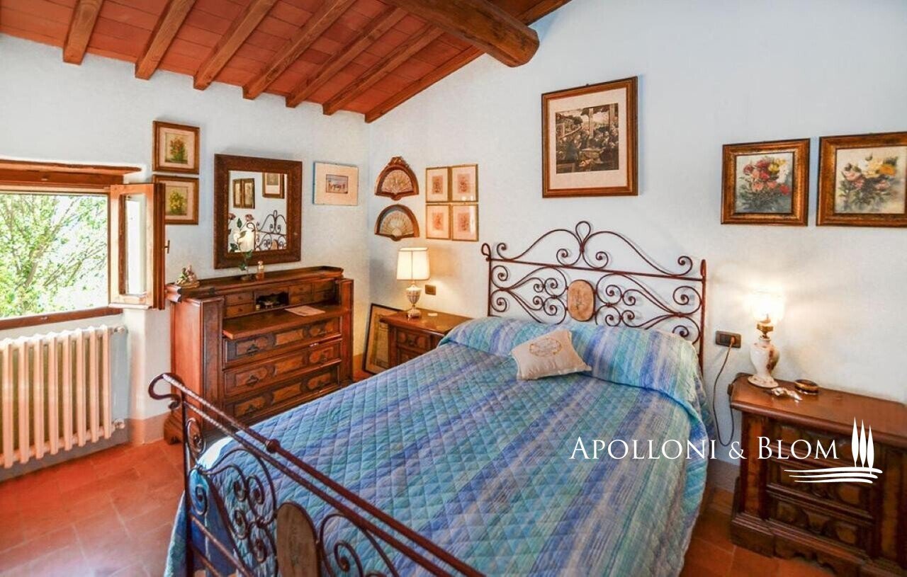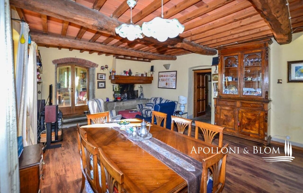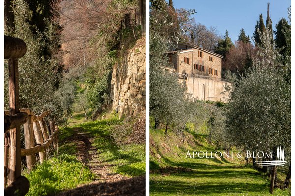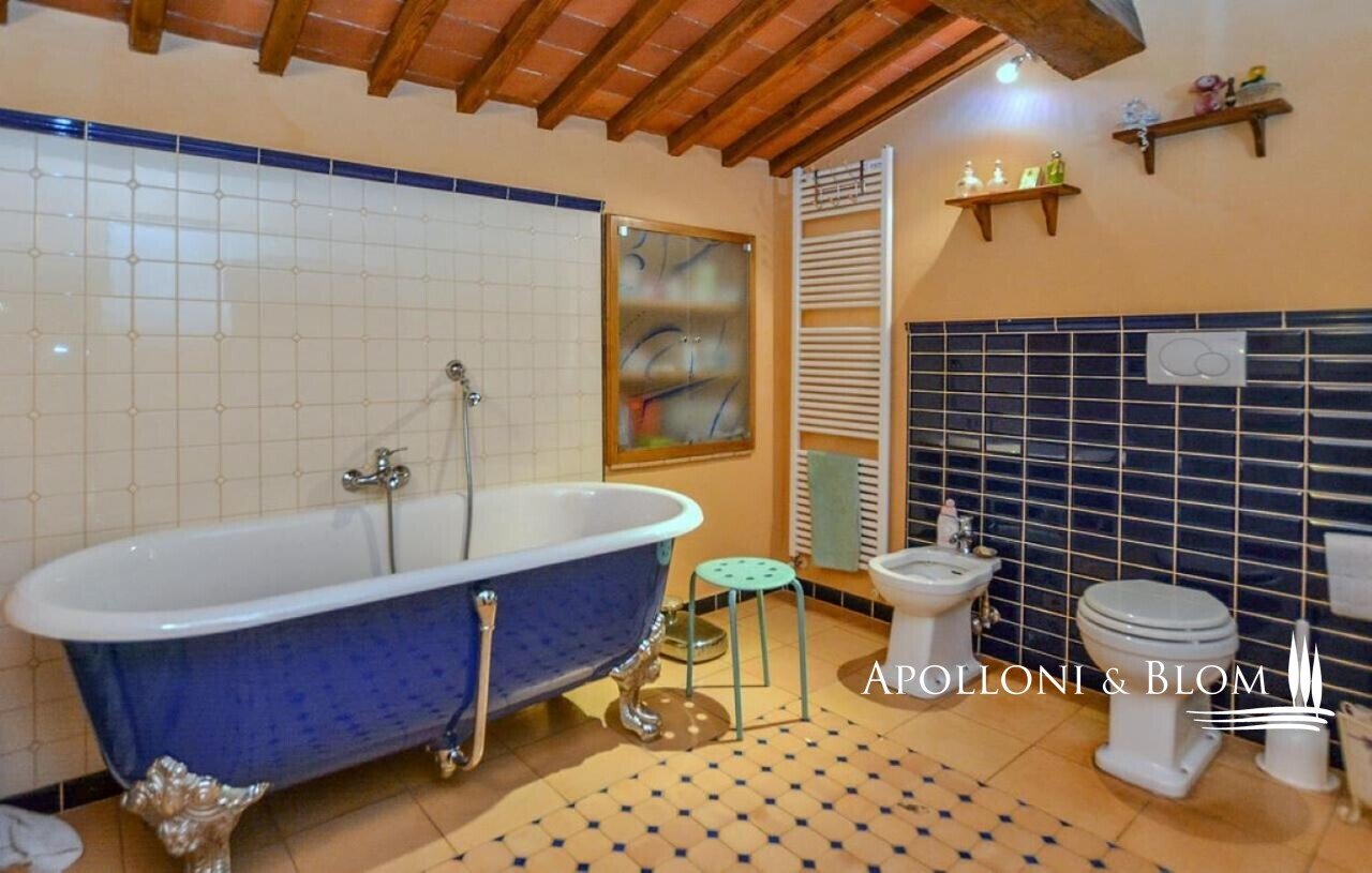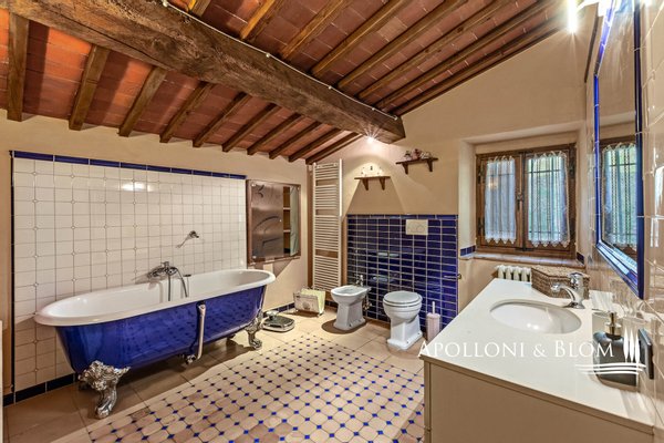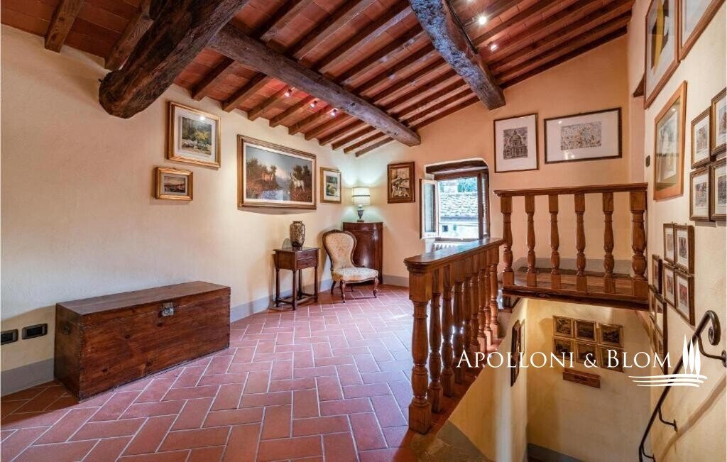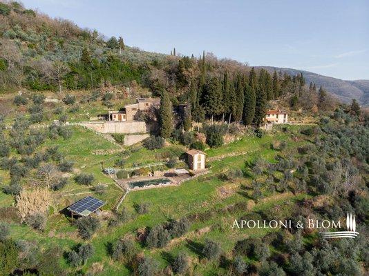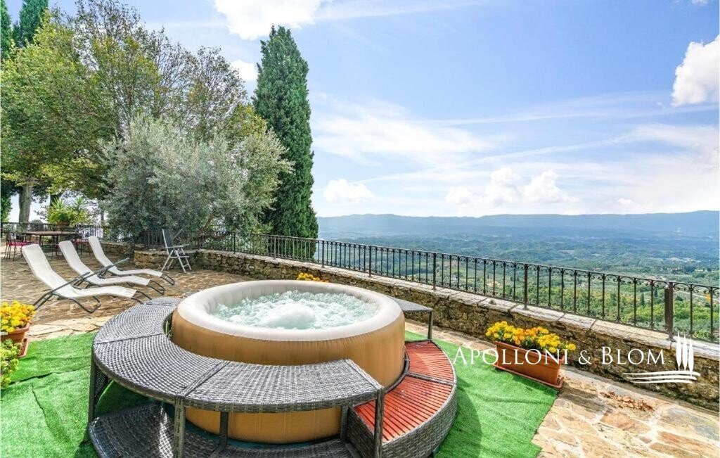 Bauernhaus aus dem 15. Jahrhundert, Nebengebäude, separate Villa, Panoramaschwimmbad, Sonnenkollektoren, 3,9 ha Land, zu verkaufen in Loro Ciuffenna, Arezzo. In Panoramalage mit atemberaubendem Blick auf das Valdarno und die Chianti-Berge, 350 Meter über dem Meeresspiegel, ist La Guardiaccia ein Refugium für alle, die sich gerne in der Natur inmitten jahrhundertealter Wälder zurückziehen und in die Ferne blicken. Das Haupthaus stammt aus dem Jahr 1400 und hat seine mittelalterlichen Natursteinfassaden und Backsteinbögen bewahrt. Es erstreckt sich über drei Etagen mit großen, belvedereartigen Terrassen, die mit Außenwohnbereichen und einem Jacuzzi ausgestattet sind. Kürzlich wurde es zu einem eleganten Landhaus mit vier Zimmern und einem Spa-Anbau mit Fitnessraum und Sauna renoviert. Alle Innenräume verfügen über eindrucksvolle Holzdecken, in einigen Zimmern sind die ursprünglichen Terrakottaböden und charmanten Steinkamine erhalten geblieben, während die neue Ausstattung mit Holzfenstern und -türen mit Doppelverglasung, Parkettböden, Bädern mit Keramikfliesen und einer neuen Photovoltaikanlage für die Strom- und Warmwasserversorgung im Sommer überzeugt. Die zentrale Etage des Bauernhauses ist der Mittelpunkt des Wohnbereichs mit einem Wohnzimmer mit Kamin, einem Esszimmer, einer Küche und Terrassen auf beiden Seiten. Das Nebengebäude mit Spa befindet sich im Hof vor dem Bauernhaus zusammen mit dem Ofen mit Grill und Veranda. Wenige Meter entfernt führt ein Gartenweg zum Swimmingpool, der von einer mit Stein und Terrakotta gepflasterten Sonnenterrasse mit Pavillon umgeben ist, und am anderen Ende zu einer ehemaligen mittelalterlichen Scheune, die restauriert und in ein romantisches Gästehaus umgewandelt wurde. Eine Zypressenallee öffnet den Zugang zu einer zweistöckigen Villa von 136 Quadratmetern, die perfekt in die Landschaft eingebettet ist. Sie bietet große Fenster und natürliches Licht in jedem Raum, Parkettboden, Sonnenkollektoren und allen modernen Komfort. La Guardiaccia ist außer von 1.730 qm Garten auch von 3,9 Hektar Land mit Olivenhainen, Wäldern und 3 Pferdeboxen umgeben. Im Herzen der toskanischen Landschaft, zwischen Florenz und Arezzo, die beide in einer halben Autostunde zu erreichen sind, 15 km von der A1 und nur zwanzig Minuten von Prada und The Mall Luxury Outlet entfernt. Loro Ciuffenna, nur 2,5 km entfernt, ist ein typisches mittelalterliches Dorf mit einem historischen Zentrum, das für die Erhaltung einer tausend Jahre alten Mühle berühmt ist, die noch in Betrieb ist. Es bietet alle Dienstleistungen, Bars, Restaurants, Geschäfte, Postamt.
