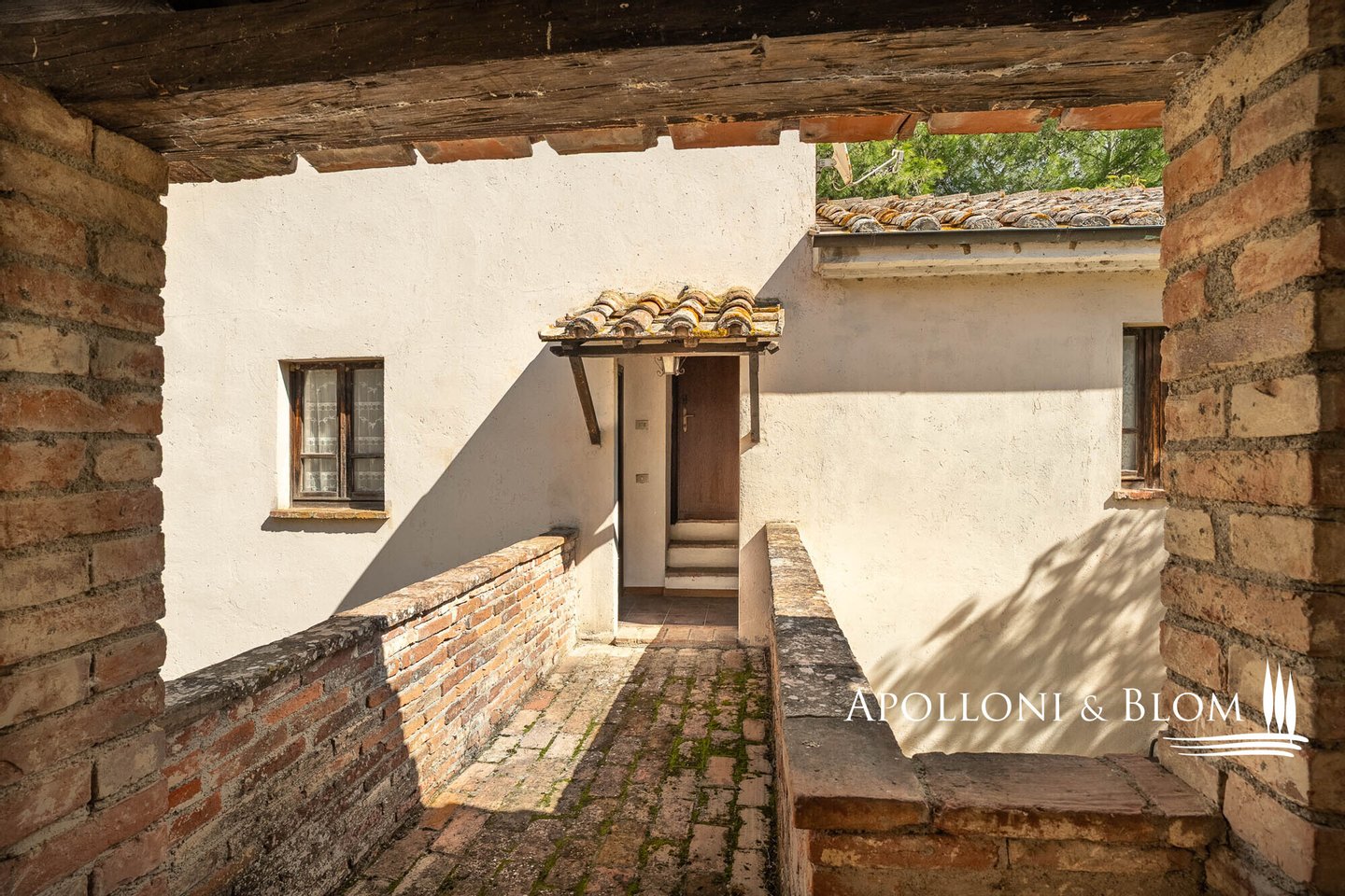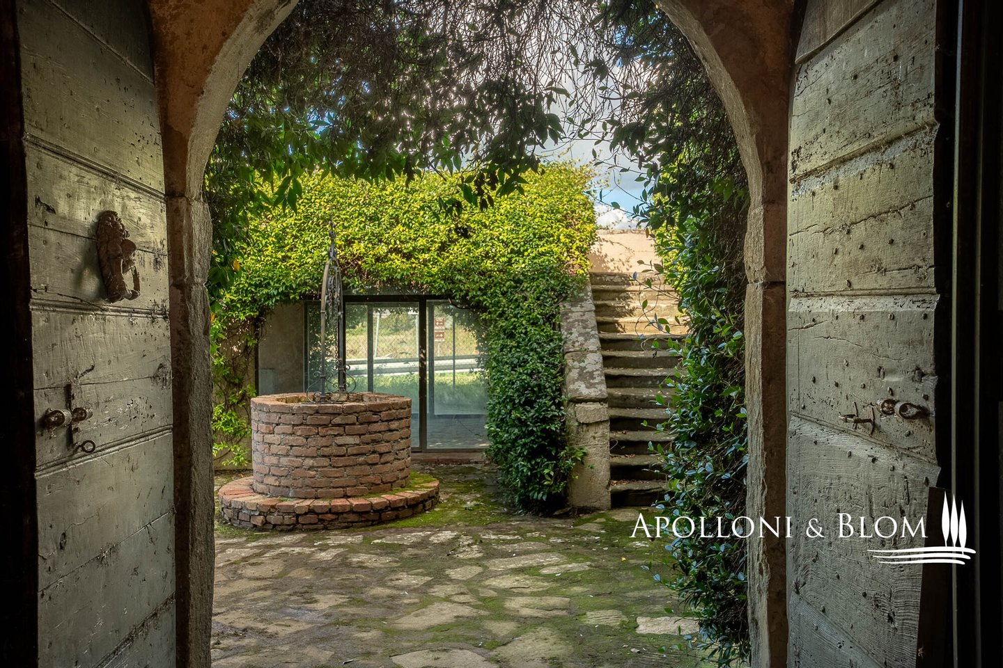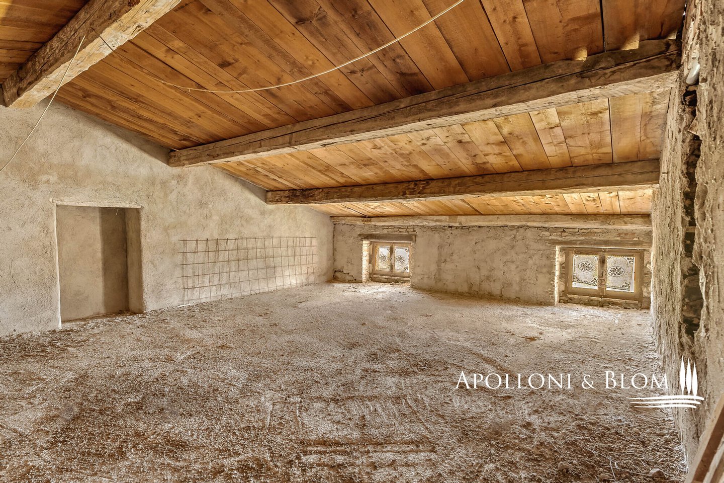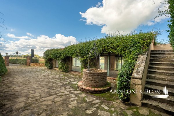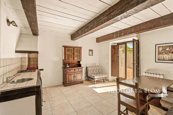 4. Gebäude: Der vorgelagerte Baukörper beherbergt auf einer Etage 1 Dreizimmerwohnung mit einem alten Brunnen im Freien. Der Rest des Gebäudes ist zweistöckig mit einem gewölbten Laubengang im Erdgeschoss, von dem aus 2 Dreizimmerwohnungen mit zwei Eingängen zum Garten zu erreichen sind. Eine Außentreppe führt zur oberen Loggia, von der aus man Zugang zu 2 Zweizimmerwohnungen mit eigener Terrasse und Blick auf den Garten hat.