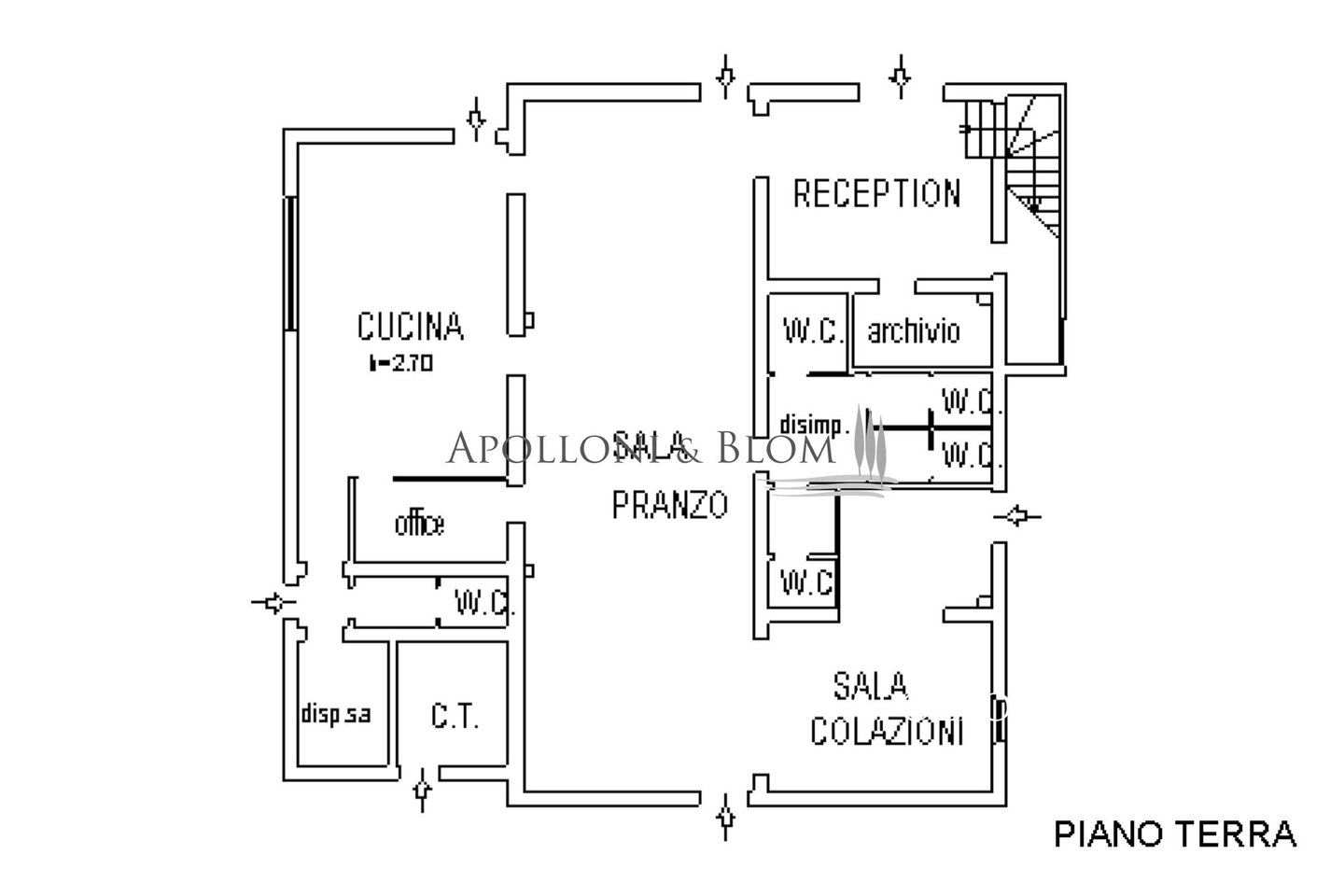 Erdgeschoss: Eingang mit Foyer, 2 Esszimmer, Büro, 5 Toiletten, Küche, Technikraum