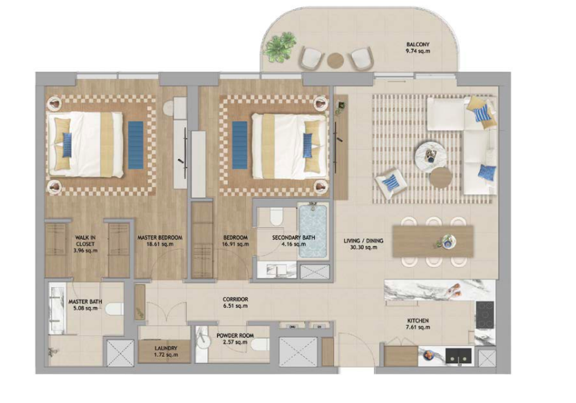 Beim Betreten der Wohnung empfängt Sie ein geräumiges Wohnzimmer, von dem aus Sie Zugang zu den zwei Schlafzimmern haben. Jedes der Schlafzimmer verfügt über einen begehbaren Kleiderschrank, in dem Sie all Ihre Kleidung und Accessoires ordentlich