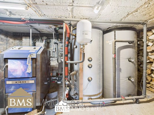 Für die energetische Versorgung gibt es eine Ölheizung mit 2.000L Tank, einen Holzvergaserofen mit 30kw Leistung, zwei offene Kamine und zur Warmwasserversorgung eine Solarthermi-Anlage auf dem Dach.