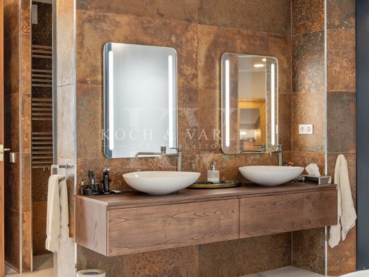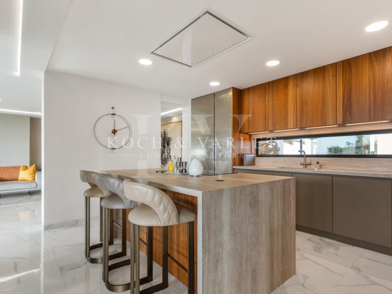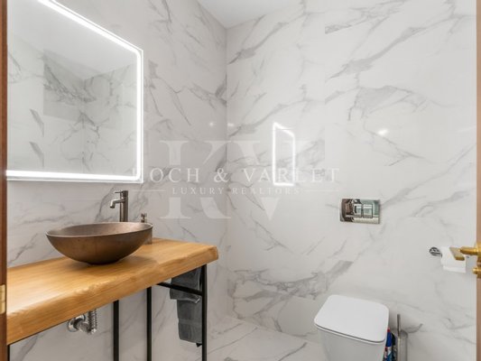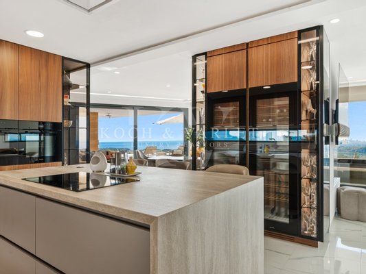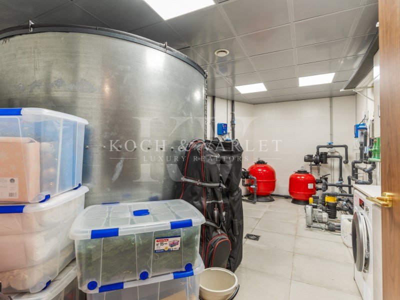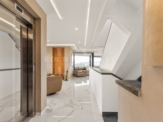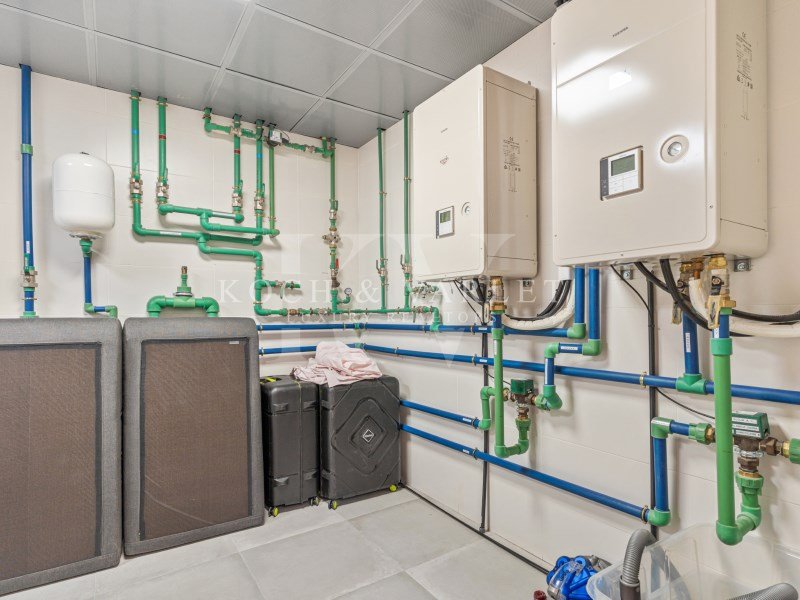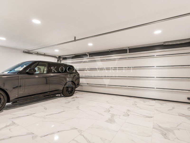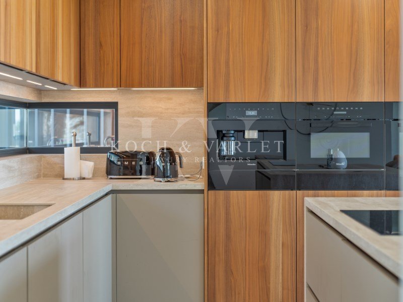 La cuisine, équipée d'appareils Miele et de meubles Doca, allie design, fonctionnalité et exclusivité. Depuis cet étage, on donne également accès à une salle de lecture douillette, des toilettes pour invités, un appartement séparé pour les invités ou le personnel de service, entièrement équipé, ainsi qu'un garage fermé pour trois voitures avec point de recharge électrique et espace de rangement supplémentaire.