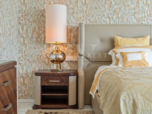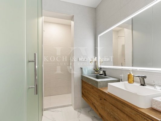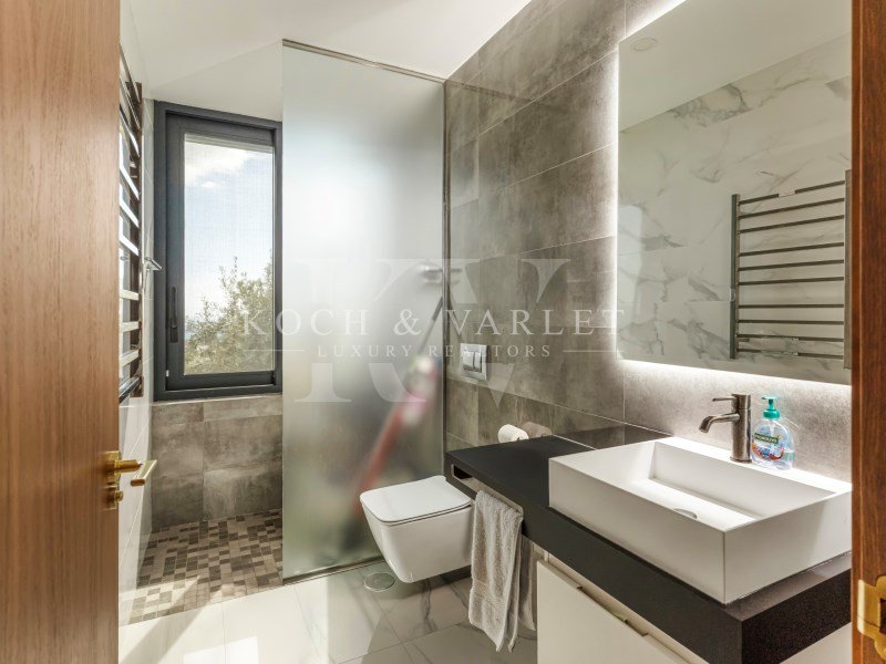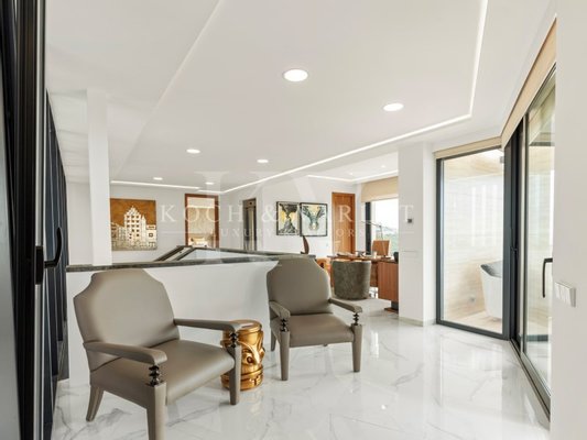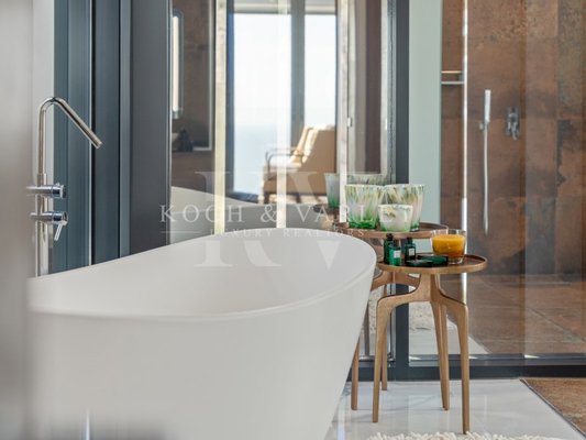La suite parentale est un espace d'une élégance pure, avec un vaste salon, une cabine d'essayage, une salle de bain en marbre avec baignoire surélevée et douche de pluie, ainsi qu'un accès direct à une terrasse panoramique surplombant la Méditerranée.