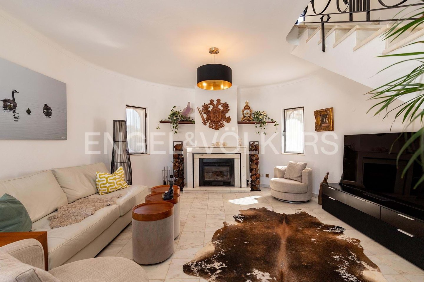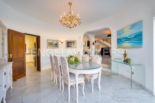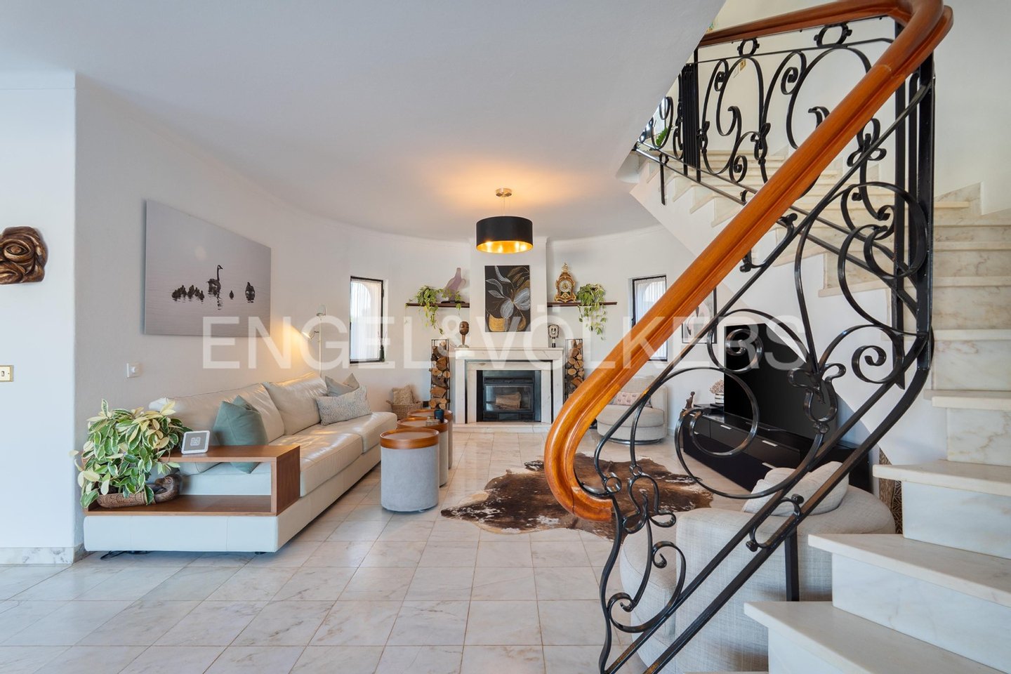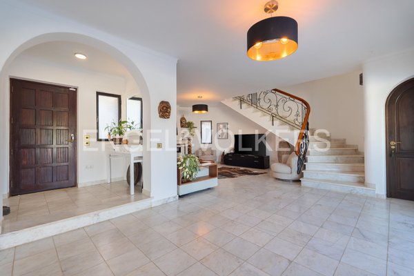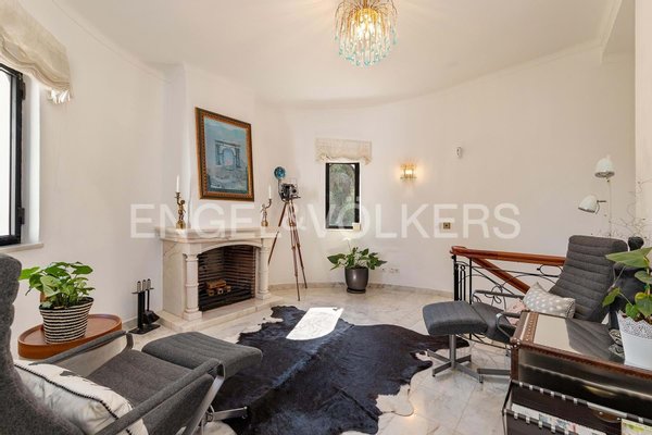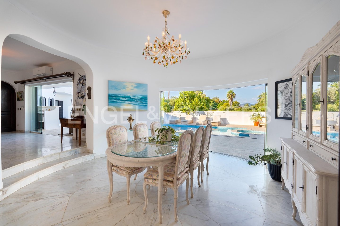 Die Eingangshalle öffnet sich zu einem geräumigen Wohnzimmer mit Marmorboden und einem gemütlichen Kamin, der nahtlos in ein beeindruckendes rundes Esszimmer übergeht. Vom Boden bis zur Decke reichende Glastüren verbinden diese Räume mit der Poolterrasse und schaffen einen mühelosen Innen-Außen-Lebensstil.