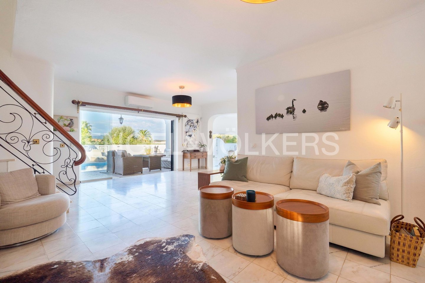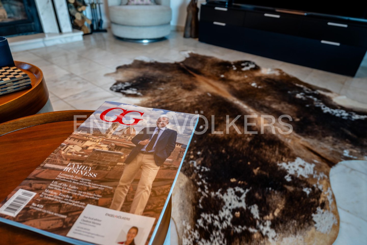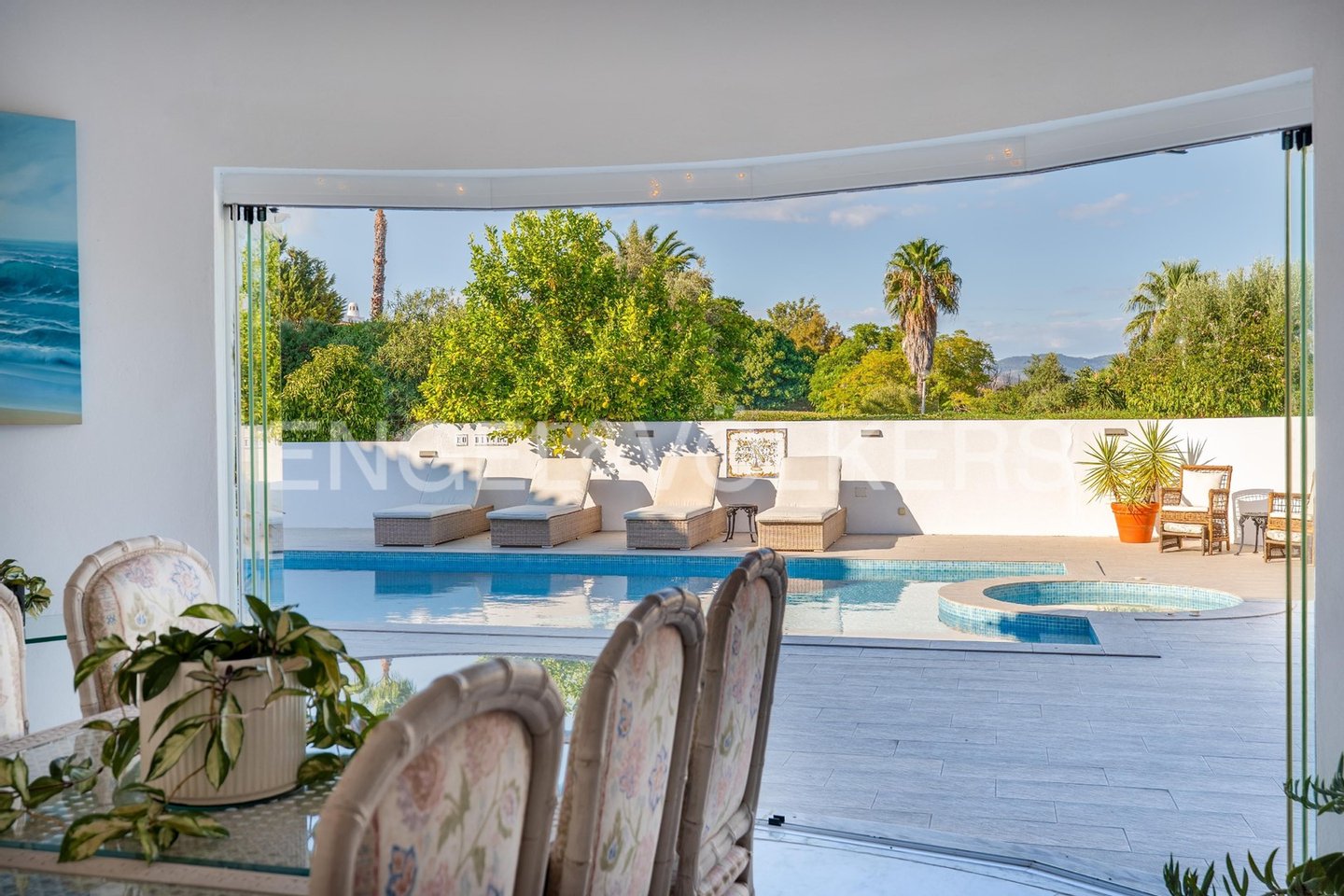 Die Eingangshalle öffnet sich zu einem geräumigen Wohnzimmer mit Marmorboden und einem gemütlichen Kamin, der nahtlos in ein beeindruckendes rundes Esszimmer übergeht. Vom Boden bis zur Decke reichende Glastüren verbinden diese Räume mit der Poolterrasse und schaffen einen mühelosen Innen-Außen-Lebensstil.