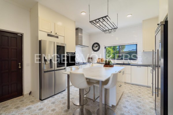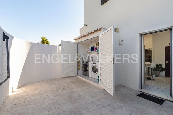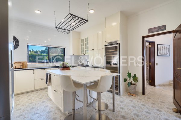 Die maßgeschneiderte Küche ist für kulinarische Enthusiasten konzipiert und verfügt über moderne Geräte, einen Weinkühlschrank und eine stilvolle Speisekammer. Ein Gäste-WC und ein Hauswirtschaftsbereich mit Patio erhöhen die Funktionalität des Hauses.