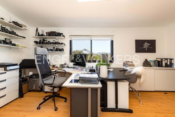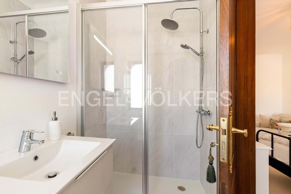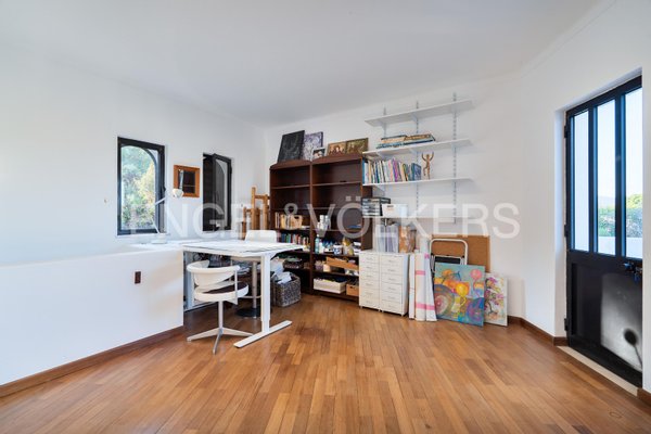 Im Erdgeschoss hat ein privater Gästeflügel seinen eigenen Eingang durch das Wohnzimmer. Er umfasst zwei Schlafzimmer mit Bad, jeweils mit Einbauschränken und direktem Zugang zur Terrasse, die einen Blick auf den Swimmingpool bietet.