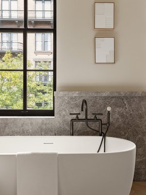 Diese 21 Fuß breite Residenz erstreckt sich über 6 Stockwerke mit 5 Schlafzimmern, 5 Badezimmern und 3 Gästetoiletten und wurde unter der fachkundigen Betreuung des preisgekrönten Architektur- und Designbüros StudioSC einer umfassenden dreijährigen Renovierung unterzogen. Das Interieur ist modern und dennoch raffiniert und verfügt über einen Aufzug, ein Savant-Hausautomationssystem, das nahtlos mit der Steuerung von Jalousien, Beleuchtung, Musik und Sicherheit verbunden ist, motorisierte Jalousien, hochmoderne Systeme, beheizte Fußböden im gesamten Haus und eine 14-Zonen-Klimaanlage mit linearen Diffusoren.