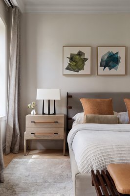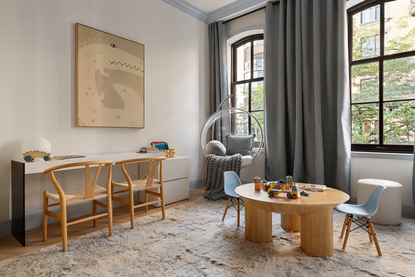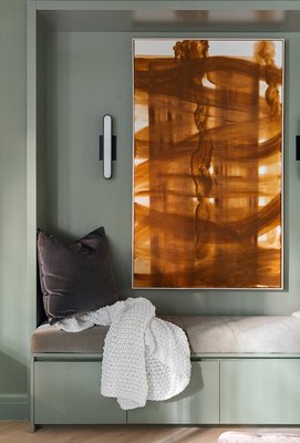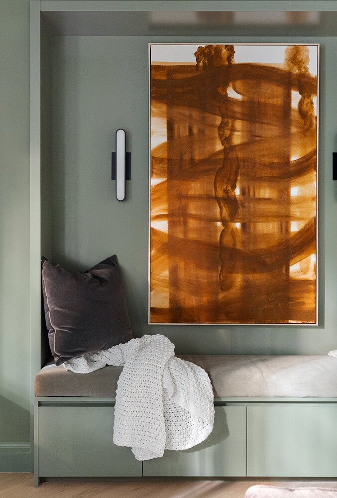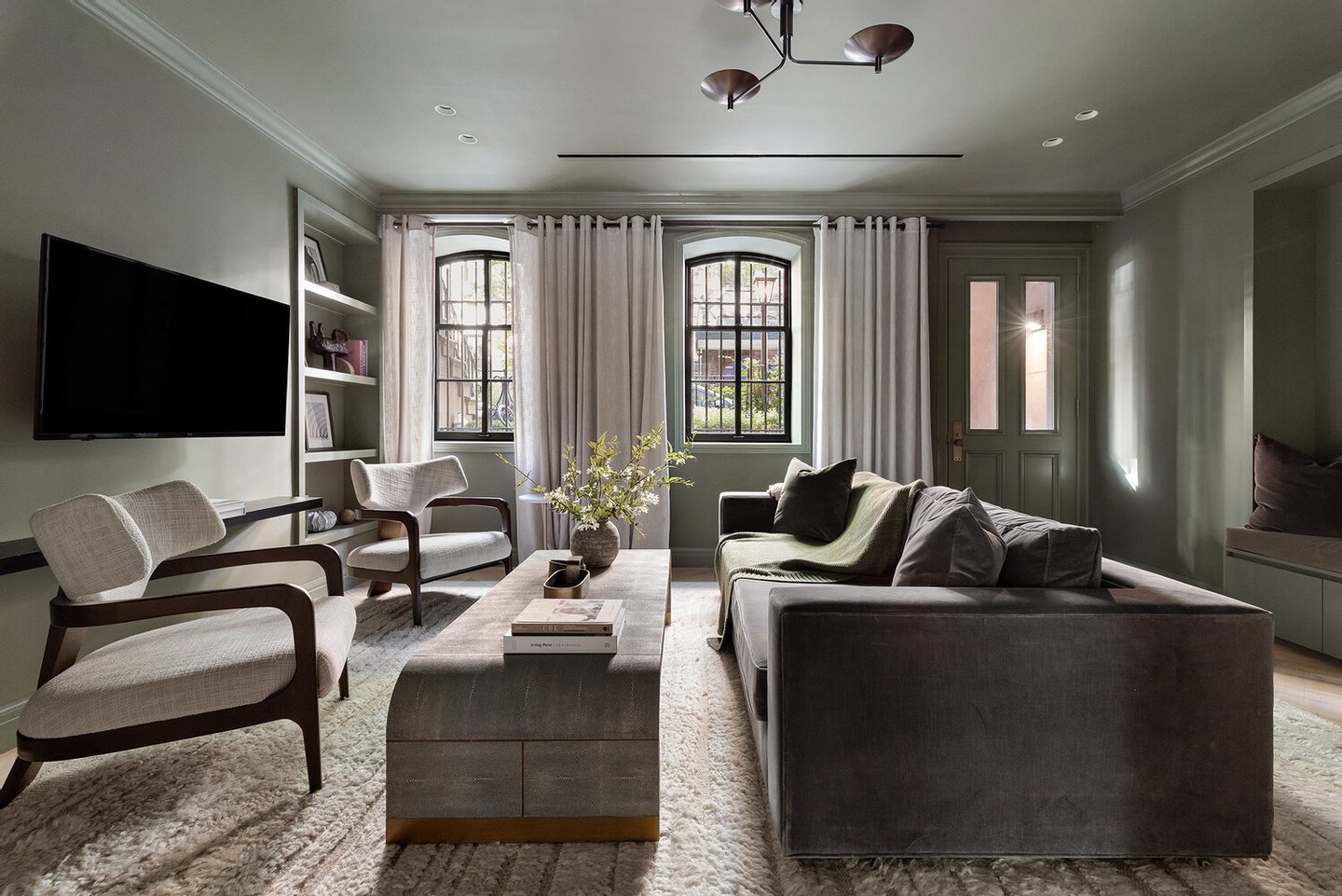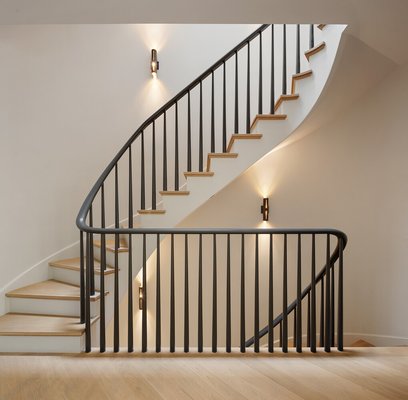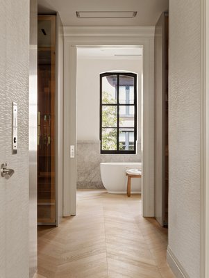 Auf den Ebenen des Gartens und des Salons befinden sich formelle Wohn- und Esszimmer, die eine Konvergenz von Tradition und moderner Handwerkskunst verkörpern. Zu den Details auf diesen Etagen gehören gewölbte Eingangsbereiche, historische Vertäfelungen, Mosaikfliesen, mit Nussbaum ausgekleidete Einbauten und importierte Chevron-Böden aus weißer Eiche aus Spanien. Das Lichtdesign ist anspruchsvoll: Einbauleuchten der belgischen Firma Delta Lighting werden mit skulpturalen Wandlampen und Pendelleuchten von renommierten Kunsthandwerkern wie Roll & Hill, Allied Maker und Apparatus kombiniert.