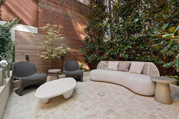 Zu den vier verschiedenen Außenbereichen gehören ein eingezäunter Vorgarten, ein mehrstöckiger Hinterhof, eine Terrasse auf Salonebene und eine Dachterrasse. Der begrünte Hinterhof und die Dachterrasse verfügen über importierte Ipe-Holzdielen, echtes Kopfsteinpflaster und robuste Bepflanzungen, darunter große Bäume, die während der Bauarbeiten von Hand über das Gelände getragen wurden. Der Hinterhof ist komplett mit einer Außenküche, einem Grill, Steinpflastersteinen und integrierter Beleuchtung und Beschallung ausgestattet. Die Sonnenterrasse auf dem Dach bietet Pflanzgefäße, mehrere Sitzbereiche und eine weite Aussicht.