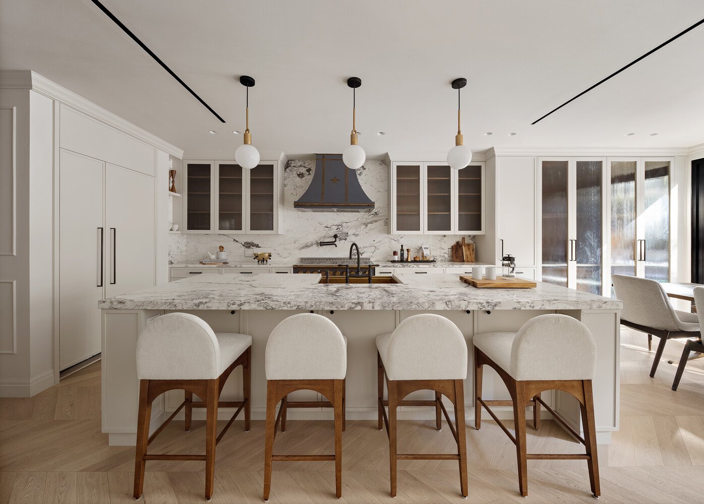 Auf der Ebene des Salons ragen luftige Decken über 11,5 Fuß in die Höhe. Ein formelles Esszimmer verankert das nördliche Ende, während ein charmanter Torbogen in das formelle Wohnzimmer führt, das in südliches Licht getaucht ist. Lehm- und holzgetäfelte Wände, ein dekorativer Kaminsims aus Calacatta Rubino-Marmor, eine eingebaute Wet-Bar und die Terrasse mit Blick auf den Garten heben die Atmosphäre auf.