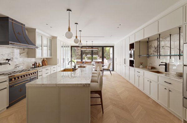 Auf der Gartenebene geht eine gemütliche Höhle mit maßgefertigten Einbauten aus Nussbaumholz in einen sonnenverwöhnten, ungezwungenen Essbereich und eine Küche des Küchenchefs über. Die Küche ist mit maßgefertigten Fräsarbeiten und maßgefertigten Schränken aus Nussbaumholz ausgestattet, die durch eine massive Wohninsel verankert sind, die mit poliertem Brekzien-Capraia-Marmor verkleidet ist. Zu den High-End-Geräten gehören ein 6-Flammen-Gasherd und eine handgefertigte Dunstabzugshaube von L'Atelier Paris, zwei L'Atelier-Spülen, ein an der Wand montierter Topffüller und reichlich Stauraum einschließlich einer begehbaren Speisekammer. Glastüren im Akkordeon-Stil öffnen sich zum üppigen Garten hinter dem Haus und verwischen die Grenze zwischen Innen und Außen.