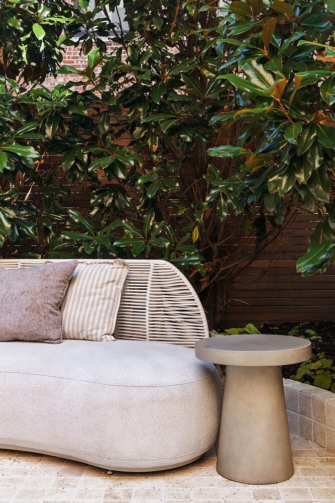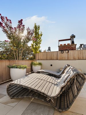 Zu den vier verschiedenen Außenbereichen gehören ein eingezäunter Vorgarten, ein mehrstöckiger Hinterhof, eine Terrasse auf Salonebene und eine Dachterrasse. Der begrünte Hinterhof und die Dachterrasse verfügen über importierte Ipe-Holzdielen, echtes Kopfsteinpflaster und robuste Bepflanzungen, darunter große Bäume, die während der Bauarbeiten von Hand über das Gelände getragen wurden. Der Hinterhof ist komplett mit einer Außenküche, einem Grill, Steinpflastersteinen und integrierter Beleuchtung und Beschallung ausgestattet. Die Sonnenterrasse auf dem Dach bietet Pflanzgefäße, mehrere Sitzbereiche und eine weite Aussicht.