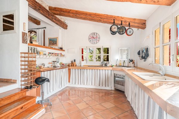 Das Haus mit einer Gesamtfläche von ca. 150 m² erstreckt sich über zwei Etagen und verfügt über zwei einladende Schlafzimmer und zwei Badezimmer. Das Erdgeschoss umfasst eine geräumige, voll ausgestattete Küche und ein einladendes Wohnzimmer mit Kamin, ideal für gemütliche Abende. Große Türen führen auf mehrere Außenterrassen, die dazu einladen, die ruhige Umgebung und die mediterrane Sonne zu genießen.