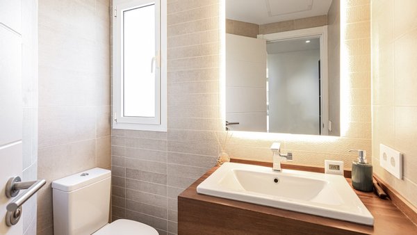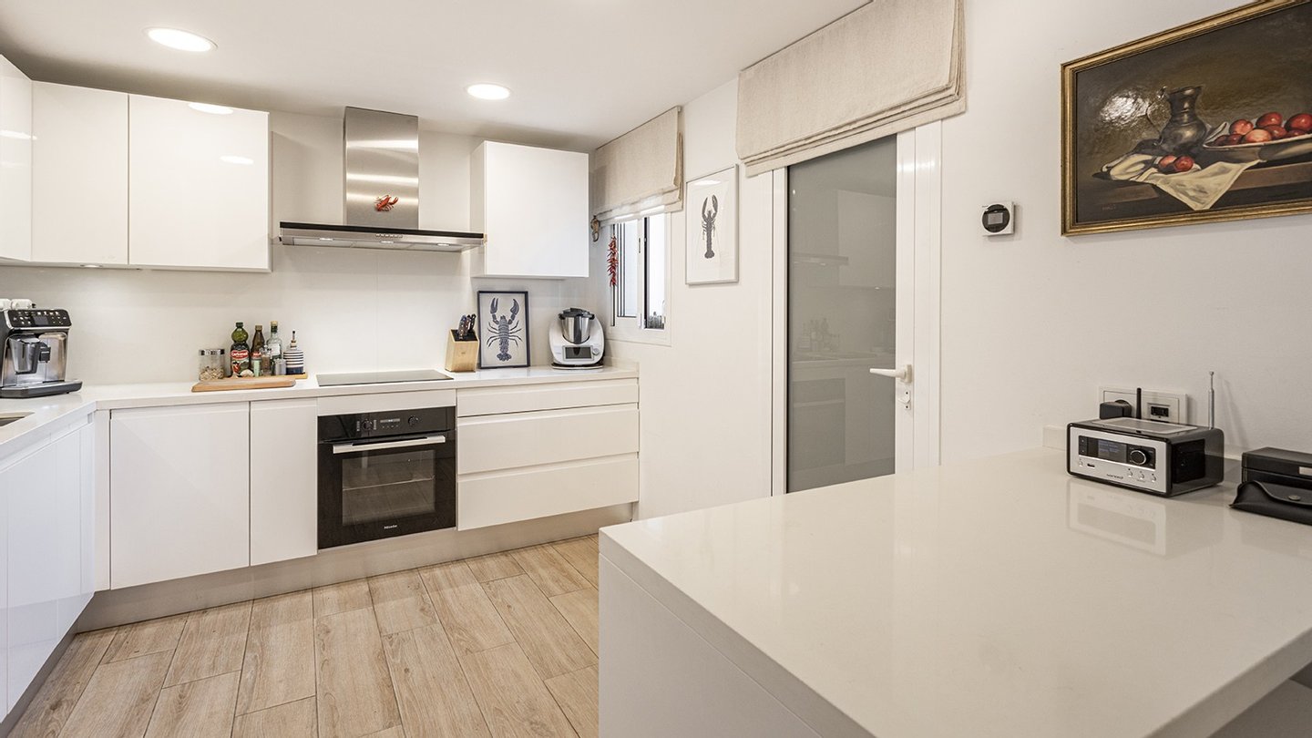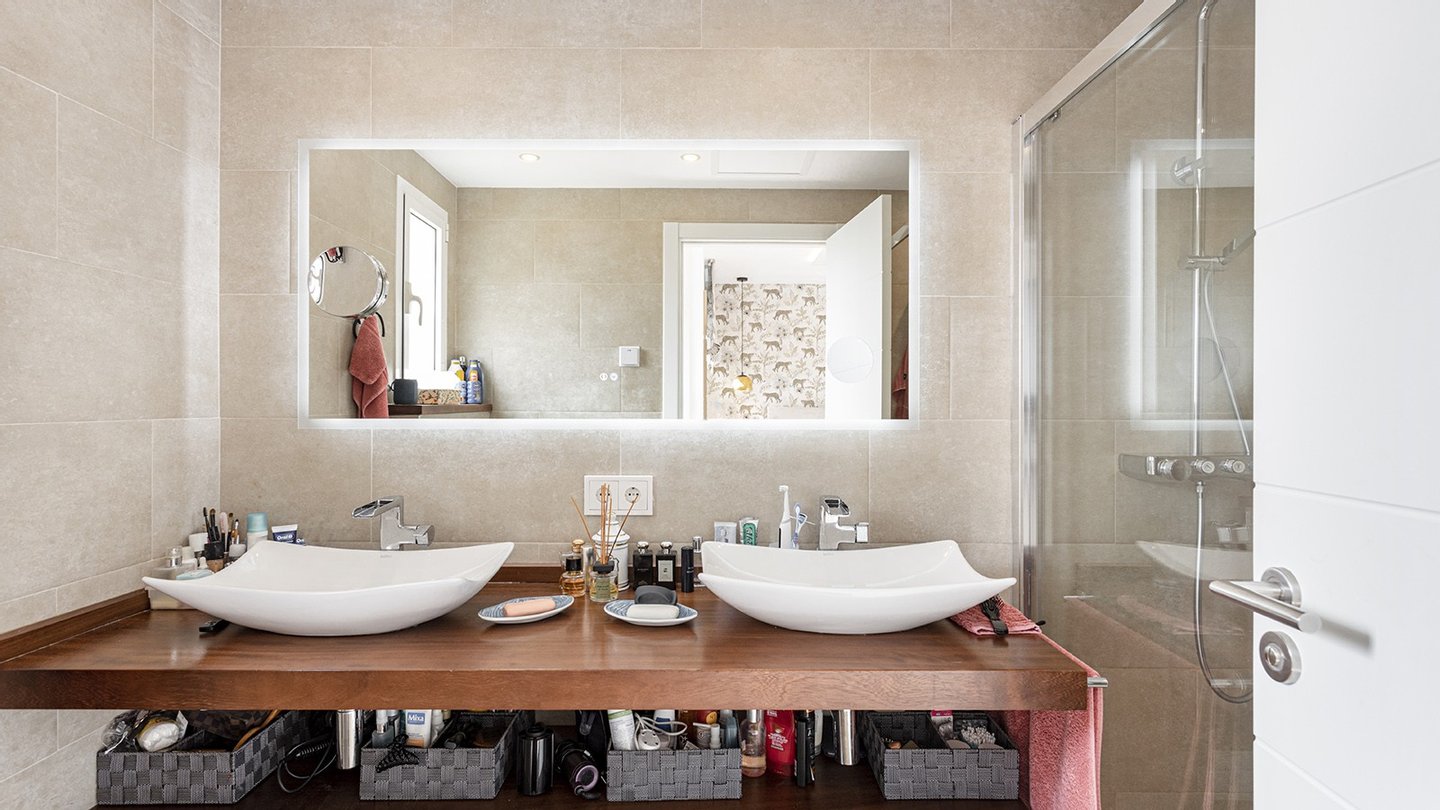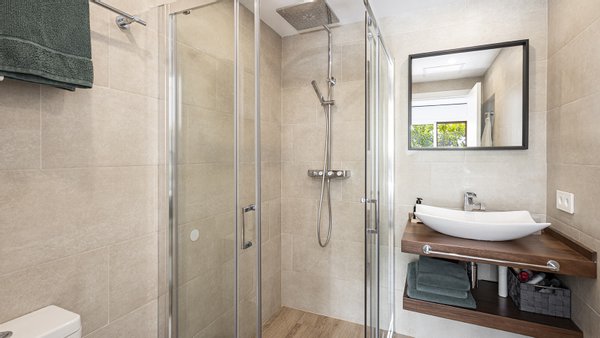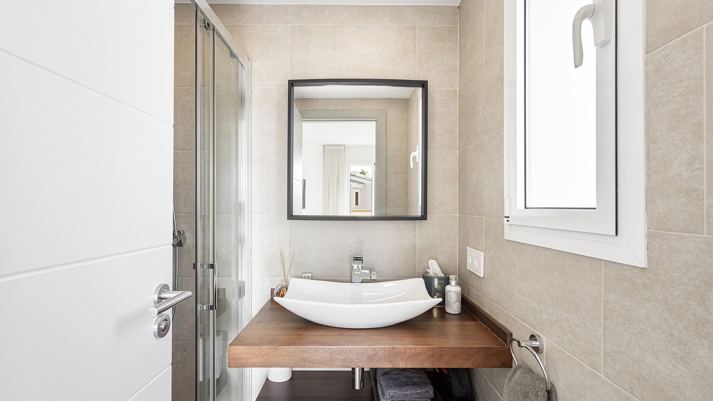 Die Villa steht auf einem ca. 280 m² großen, gepflegten Grundstück und verfügt über eine bebaute Wohnfläche von ca. 168 m². Die Immobilie verteilt sich auf zwei Ebenen. Im Erdgeschoss befinden sich ein heller Wohn-/Essbereich mit gemütlichem Kamin und Zugang zur Terrasse und zum Garten, eine voll ausgestattete Küche mit eleganten Hochschränken, ein Doppelschlafzimmer mit Einbauschränken, ein Badezimmer en Suite, ein Gäste WC sowie ein Hauswirtschaftsraum. Im Obergeschoss liegen zwei weitere Schlafzimmer mit Badezimmern en Suite. Das Hauptschlafzimmer hat Zugang zu einer privaten Sonnenterrasse mit ca. 11 m². Der Fliesenboden im Haus hat eine Holzoptik. In den Bädern ist eine Fußbodenheizung verlegt. Sowohl die Klimaanlage w/k als auch die Infrarotheizung können per App gesteuert werden. Außerdem gibt es Einbauschränke, Wärmepumpe, elektrische Sonnenmarkise, Wasserenthärtungsanlage, doppeltverglaste PVC-Fenster, Sonnenblenden und Fliegengitter. Für die Sicherheit sind Eufy-Überwachungskameras, eine Gegensprechanlage, SAT-TV und ein Glasfaseranschluss vorhanden. Der ca. 149 m² große, mediterran angelegte Gartenbereich verfügt über eine automatische Gartenbewässerung und eine ?Casita? für zusätzlichen Stauraum. Der Gemeinschaftsbereich verfügt über einen großen und erfrischenden Swimmingpool, der von Liegeflächen mit Blick auf den Golfplatz und gemeinschaftlichen Grünflächen umgeben ist. Zwei PKW-Stellplätze direkt vor der Haustür mit Ladestation (Wallbox) für E-Autos runden das Top-Angebot ab.