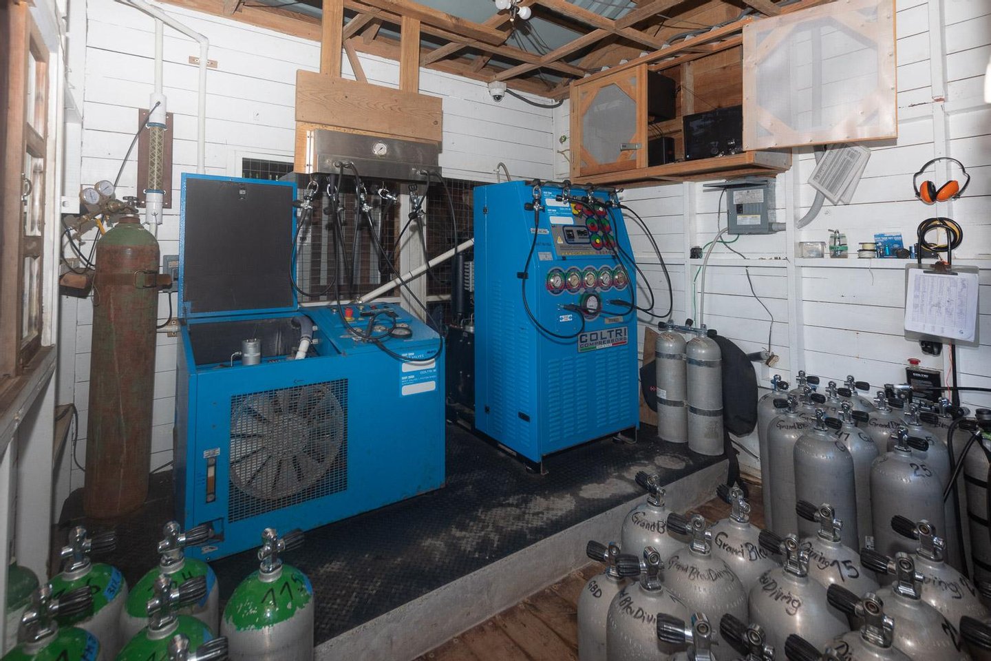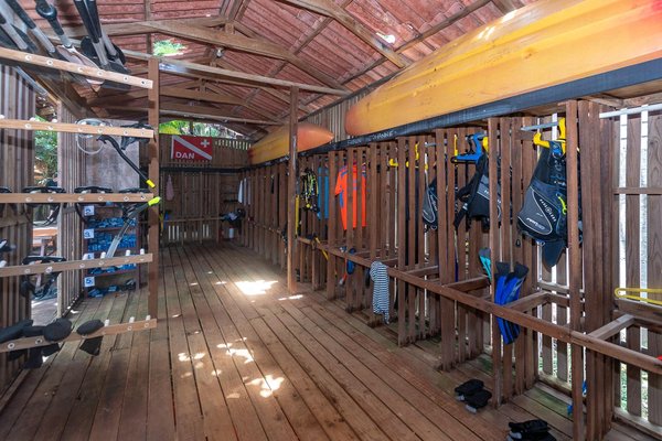 Zur Ausrüstung der Tauchbasis gehören ein Coltri MCH16 Luft-/Nitrox-Kompressor, ein Coltri MCH22 Luftkompressor, 22 Aqualung BCDs, 15 Apex-Atemregler, 28 Flossen, 18 Masken, 2 Paddleboards, 2 Doppelkajaks, 2 Einzelkajaks, 40 Luftflaschen und 18 Nitroxflaschen.