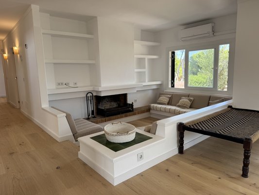 Im Inneren führt eine breite Treppe zu einem hellen und großzügigen Wohn- und Essbereich mit offener Raumaufteilung und Zugang zu einer großen Terrasse. Auf derselben Etage befinden sich drei Schlafzimmer, jedes mit eigenem Balkon oder kleiner Terrasse. Zwei der Schlafzimmer verfügen über ein eigenes Bad en suite; zusätzlich gibt es ein separates Gästebad.