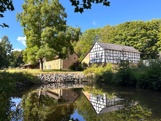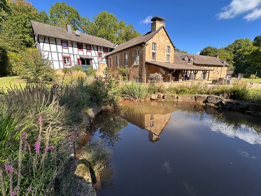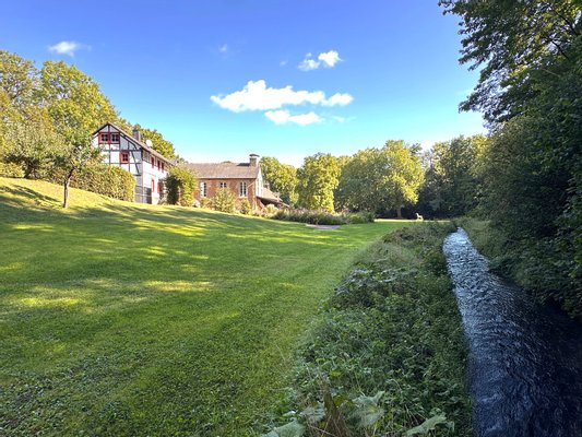 Es handelt sich um ein prachtvolles, exklusives Mühlenanwesen aus dem 15. Jahrhundert n. Chr. in einem außergewöhnlich gutem, originalgetreuen Erhaltungszustand. Zum Anwesen gehören das großzügige Haupthaus, ein Verwalterwohnhaus, eine große Scheune mit Fahrzeugremise und ein kleiner Pferdestall mit angrenzendem Lager auf einem gepflegtem, parkähnlichem Grundstück mit zwei Teichen. Das Grundstück wird nach Osten durch einen Bach begrenzt.