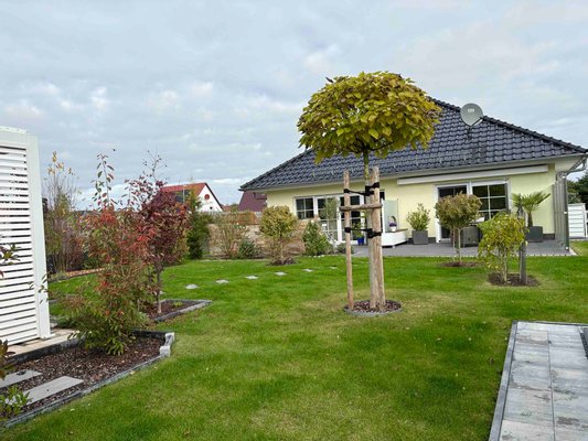 Modern und neuwertig präsentiert sich dieser schöne Bungalow, stilvoll eingebettet in einen Mix aus gewachsenem Wohngebiet und neuer Siedlung mit überwiegend Einfamilienhäusern und großzügigen Gärten. Das durchgehend ebenerdig gestaltete Einfamilienhaus wurde 2021 in massiver und hochwertiger Bauweise errichtet und präsentiert sich in neuwertiger Qualität. Die zeitlose und ästhetischen Architektur in Kombination mit einer inspirierenden Gartengestaltung, welche mit einigen Highlights aufwartet, erzeugt augenblicklich heimelige Atmosphäre. Der geschickt vor Einblicken und Wind geschützt angelegte Gartenbereich bietet Intimität und eine Oase der Ruhe. Eine gepflasterte Terrasse erstreckt sich an der Gebäuderückseite, flankiert von einer mediterran anmutenden, halbhohen Mauer, Blumenbeeten und Rasenfläche. Die isolierverglasten Fenster mit charmanten Sprossen unterstreichen das ländlich-moderne Flair.