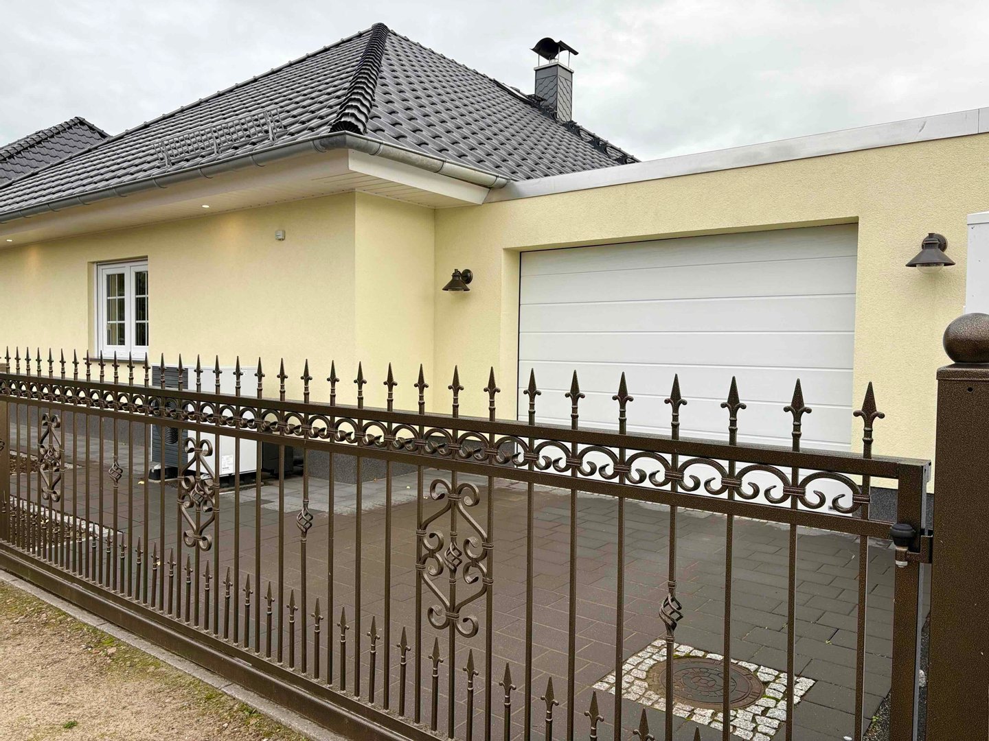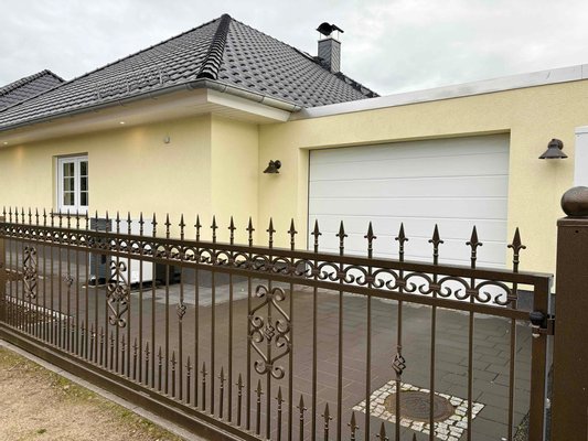 Stylische Zaunanlagen säumen das Grundstück. Auffahrt und Eingang werden von einer stilvollen, elektrischen Toranlage gesichert. An der Garagenrückseite befindet sich ein Zugang in den Garten. Seitlich gelangen Sie in den Hauswirtschaftsraum, welcher Platz für weitere Kühlbereiche und Lagerflächen bietet.