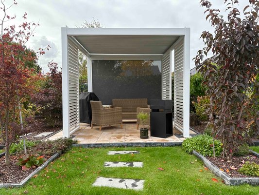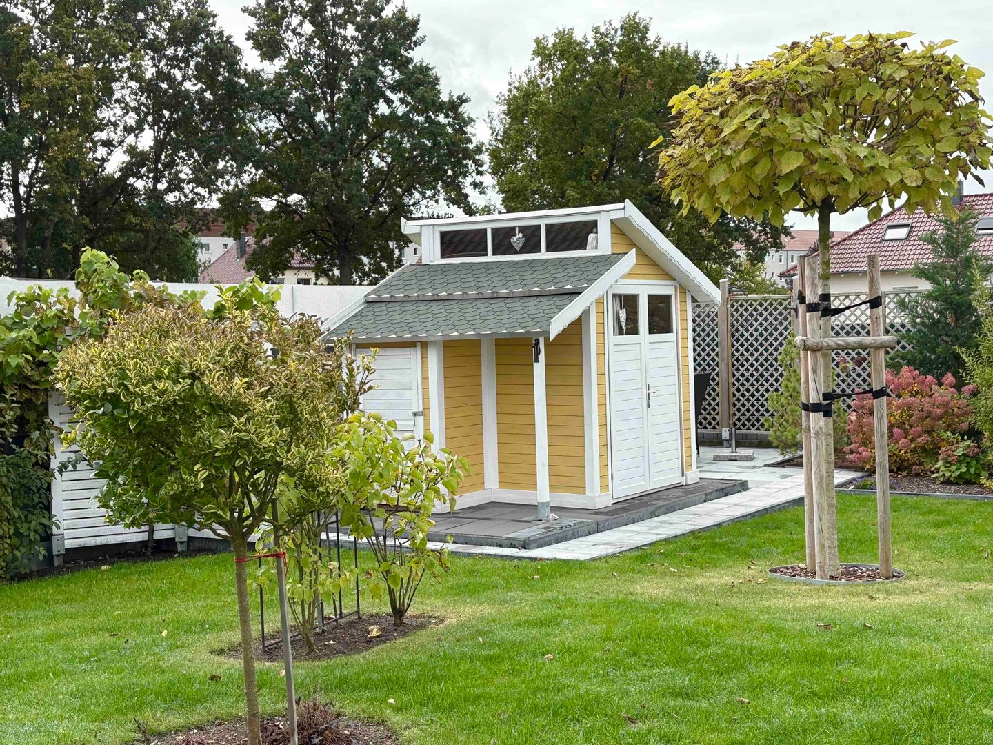 - Der Garten wartet mit blühenden Rabatten, einer hochwertigen Pergola sowie hölzernem Gartenhaus auf