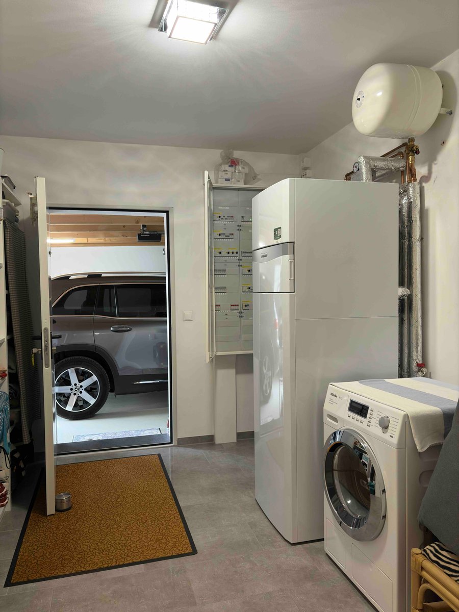 Die Energieeffizienz des Hauses liegt mit nur 32 kWh/m2a (Effizienzklasse A) im Top-Bereich. Die Heizung wird mit einer Vaillant Luft-Wasser-Wärmepumpe inklusive Kühlung betrieben und alle Räume verfügen über angenehme Fußbodenheizung.