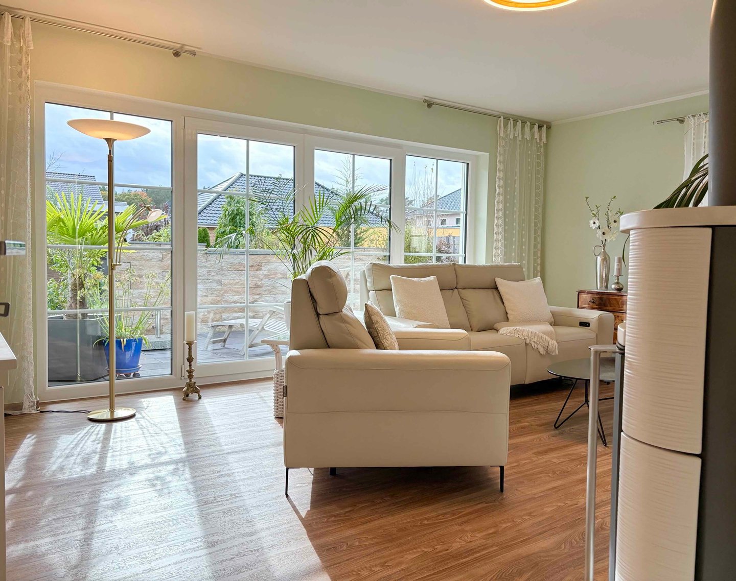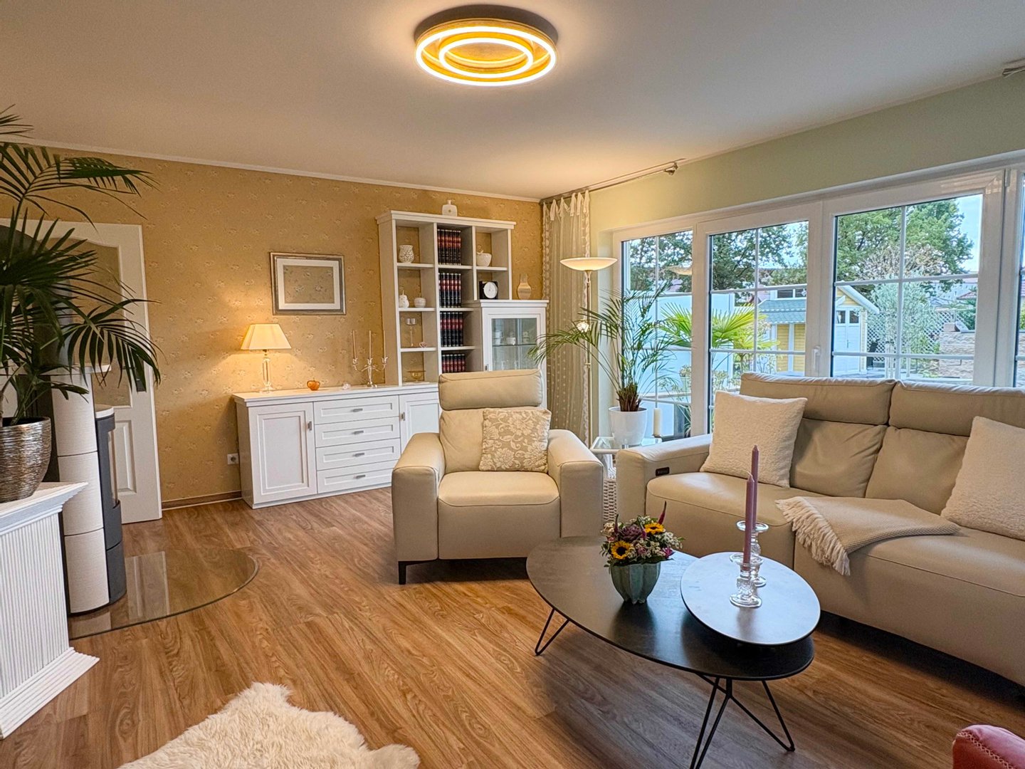 - Küche, Wohn- und Schlafzimmer bieten Zugang zu Terrasse und Garten und verfügen über großzügige Fensterflächen welche herrliche Ausblicke in den Garten gewähren