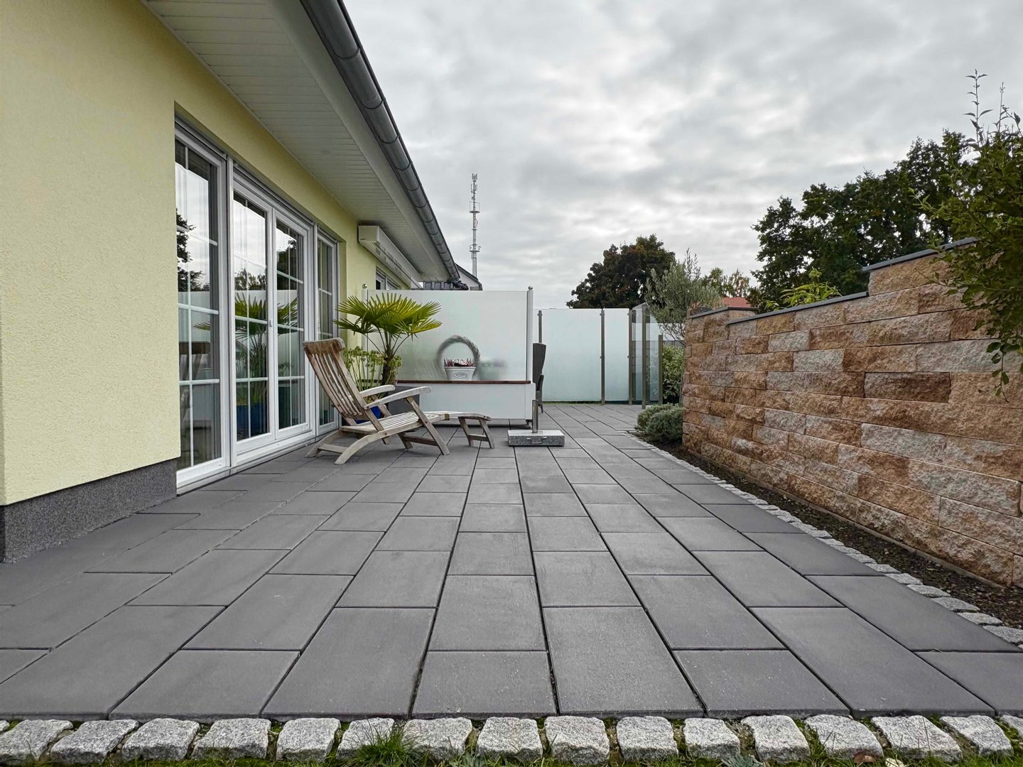 Modern und neuwertig präsentiert sich dieser schöne Bungalow, stilvoll eingebettet in einen Mix aus gewachsenem Wohngebiet und neuer Siedlung mit überwiegend Einfamilienhäusern und großzügigen Gärten. Das durchgehend ebenerdig gestaltete Einfamilienhaus wurde 2021 in massiver und hochwertiger Bauweise errichtet und präsentiert sich in neuwertiger Qualität. Die zeitlose und ästhetischen Architektur in Kombination mit einer inspirierenden Gartengestaltung, welche mit einigen Highlights aufwartet, erzeugt augenblicklich heimelige Atmosphäre. Der geschickt vor Einblicken und Wind geschützt angelegte Gartenbereich bietet Intimität und eine Oase der Ruhe. Eine gepflasterte Terrasse erstreckt sich an der Gebäuderückseite, flankiert von einer mediterran anmutenden, halbhohen Mauer, Blumenbeeten und Rasenfläche. Die isolierverglasten Fenster mit charmanten Sprossen unterstreichen das ländlich-moderne Flair.