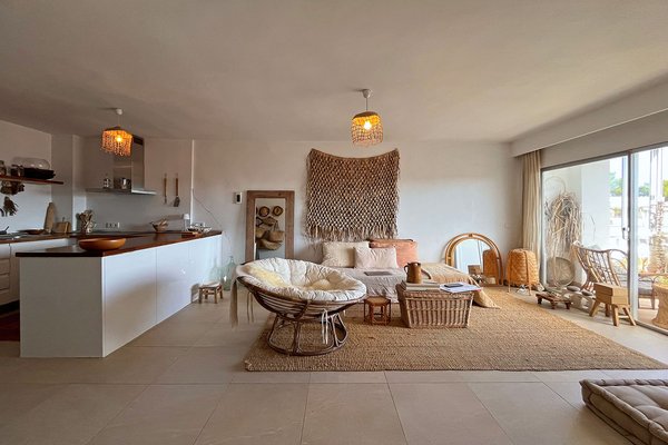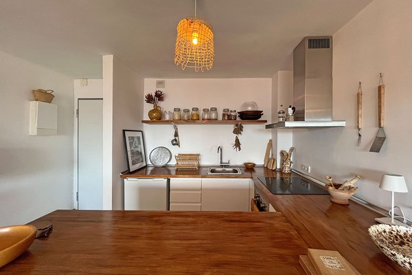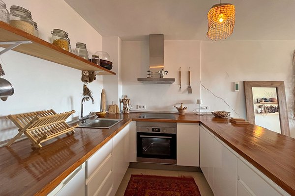 Das renovierte Apartment verfügt über eine modern ausgestattete Küche, die offen in den Wohn- und Essbereich integriert ist. Von hier aus gelangt man direkt auf die 10 m² große Terrasse. Hinzu kommen zwei Schlafzimmer sowie ein Badezimmer.