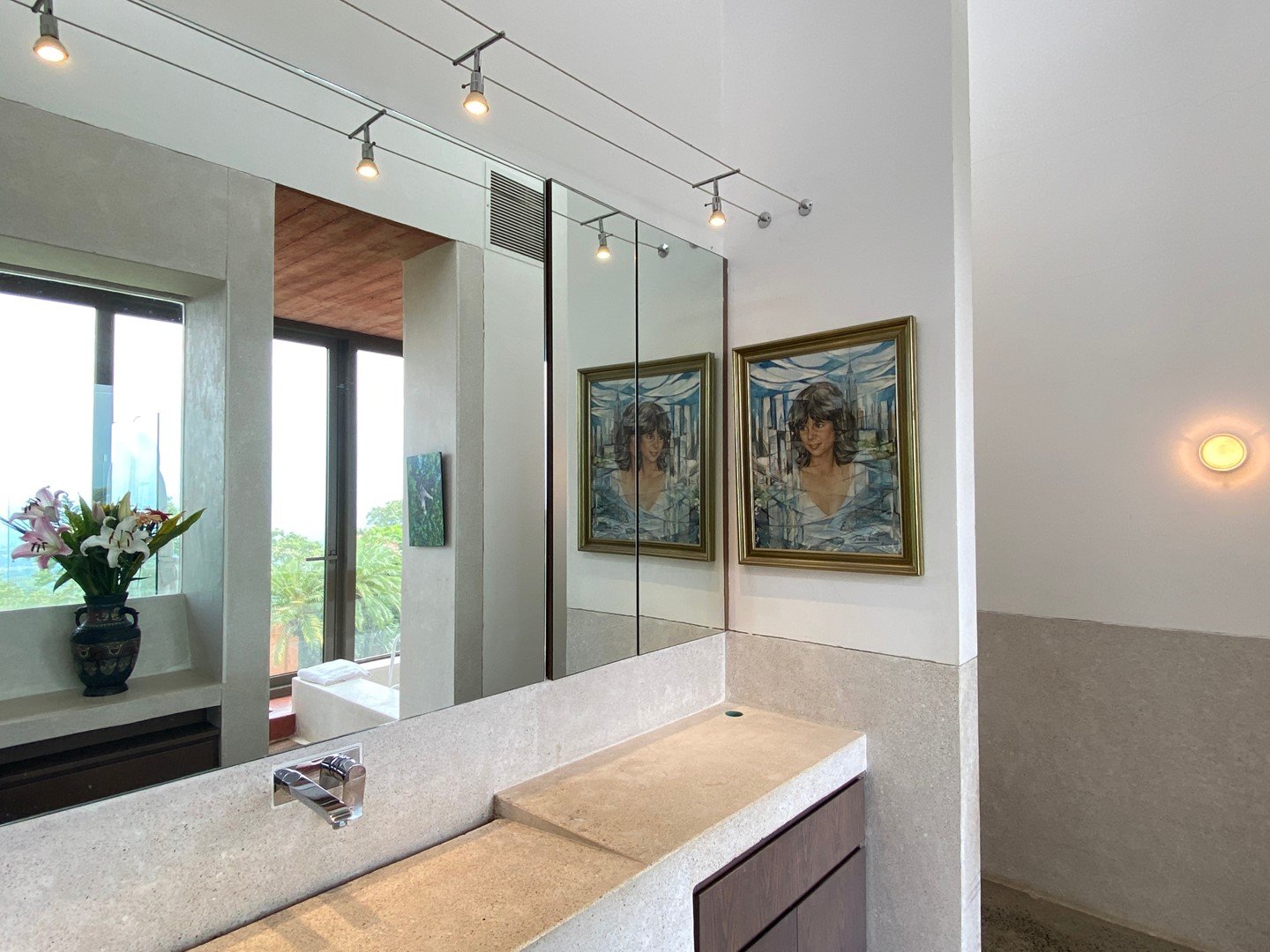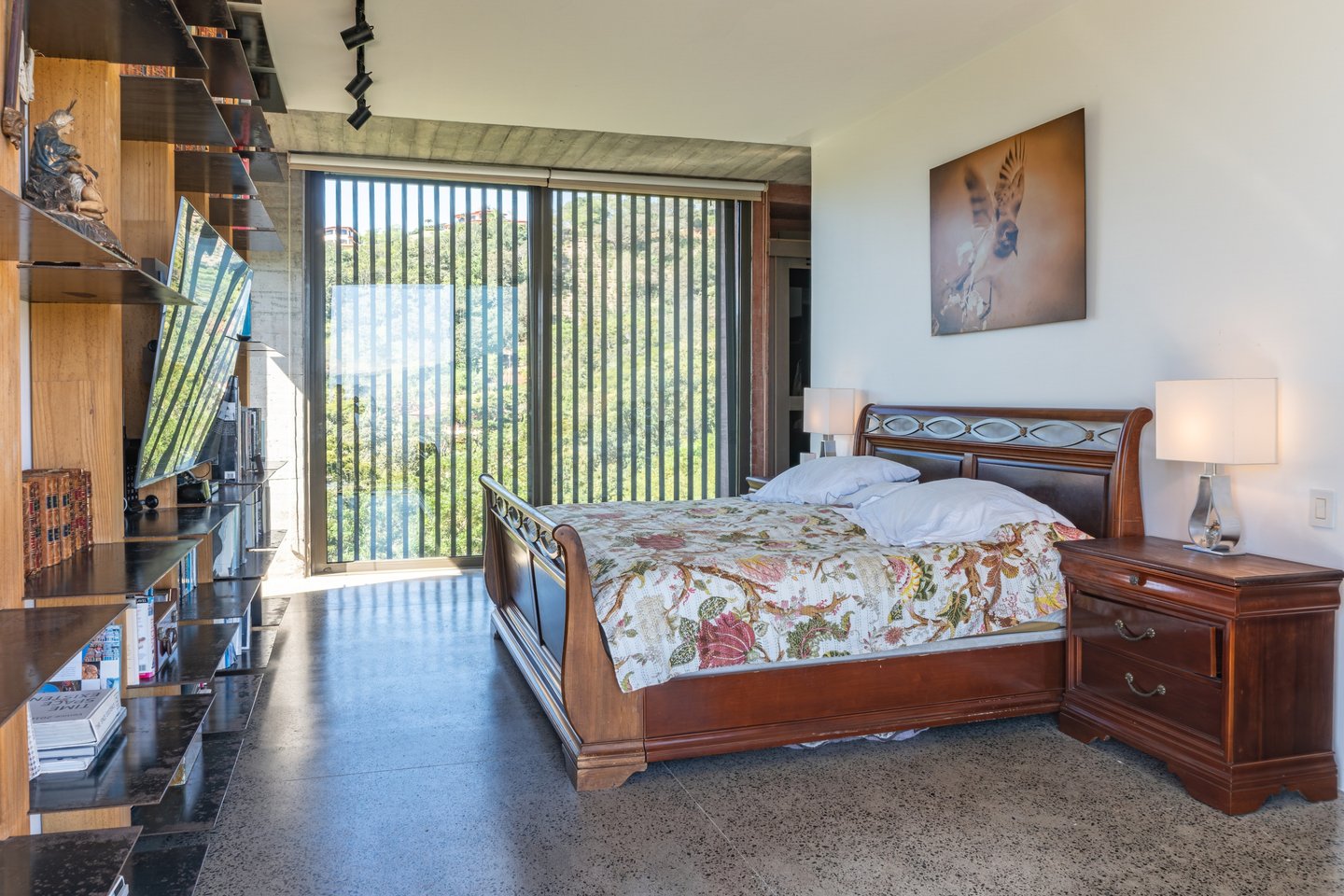 Im Obergeschoss befindet sich die Hauptsuite, ein privates Refugium mit einem Badezimmer im Spa-Stil mit einer Badewanne, einem großzügigen begehbaren Kleiderschrank und einer faszinierenden Aussicht, die zur Ruhe und Besinnung einlädt. Die untere Ebene bietet ein geräumiges Büro, eine Gästesuite mit eigenem Bad und viel Stauraum.