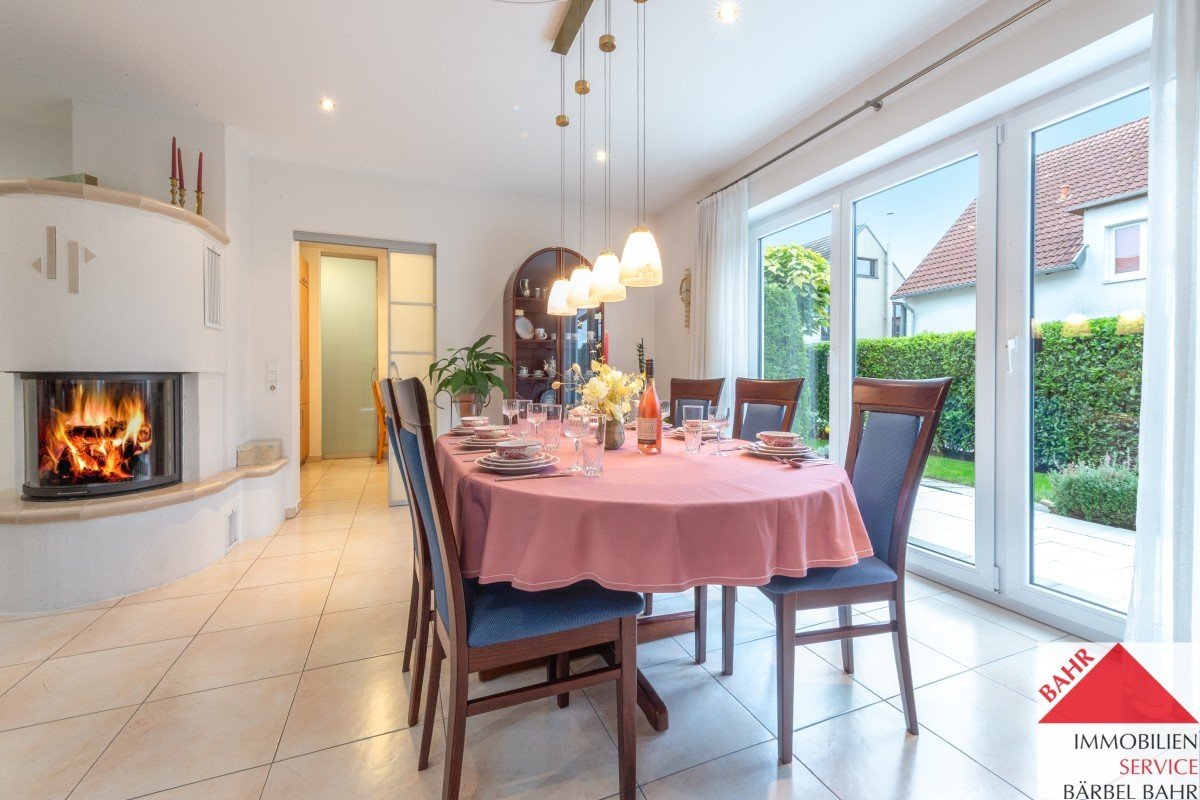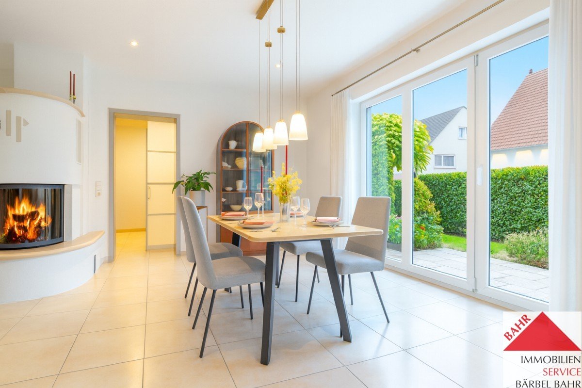Ein absolutes Highlight ist der offene Wohn- und Essbereich mit Kamin. Die Einbauküche ist mit hochwertigen Geräten ausgestattet, die keine Wünsche offenlassen sowie einem direkt angebauten Vorratsraum.