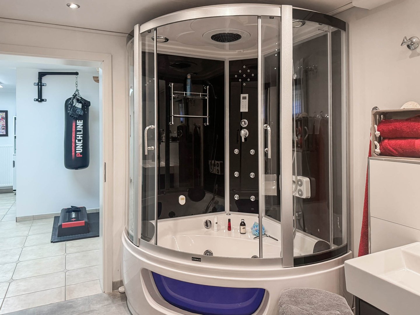 Im teilweisen wohnlich ausgebauten Untergeschoss finden sich Fitnessraum mit Sauna, Wellnessbad, Home-Office und ein weiterer Raum für Hobby oder als Schlafraum. Daneben befinden sich Heizung, Waschküche und Werkraum.