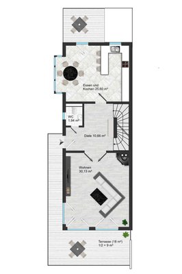 Im Erdgeschoss heißt Sie ein großzügiger Eingangsbereich willkommen, der den Blick in die Wohnküche und das rechts gelegene Wohnzimmer freigibt. Der helle, freundliche Wohn- und Essbereich mit Kamin öffnet sich zur sonnigen Südterrasse und überzeugt durch große Fensterflächen, die viel Licht und Weite schaffen. Die gepflegte Wohnküche ist mit einer funktionalen Einbauküche, Granitarbeitsplatte und allen Geräten des täglichen Bedarfs ausgestattet. Von hier aus haben Sie zudem einen direkten Zugang in den Garten auf der Nordseite – ein schöner Ort für ruhige schattige Momente im Freien.