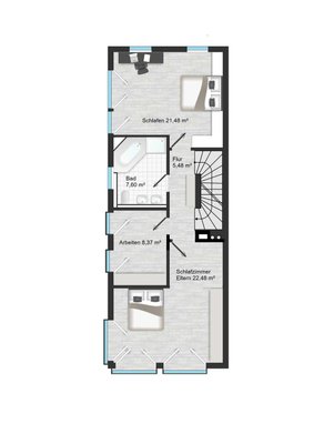 Über eine elegante Steintreppe gelangen Sie ins Obergeschoss, das mit zwei großzügigen Schlafzimmern und einem hellen Büro viel Raum für Rückzug und Entfaltung bietet. Das stilvolle Tageslichtbad mit Badewanne, Dusche, Doppelwaschtisch und WC vereint Komfort und Wohlfühlatmosphäre. Sowohl hier als auch im Dachgeschoss wurde ein neuer, hochwertiger Vinylboden verlegt, der den Räumen eine moderne und harmonische Note verleiht.