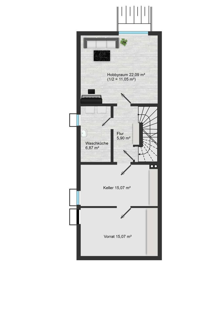 Das Haus ist vollständig unterkellert und verfügt über einen großzügigen Hobbyraum in Wohnraumqualität. Durch die große Naturabböschung fällt reichlich Tageslicht ein, wodurch der Raum hell und freundlich wirkt – ideal nutzbar als zusätzlicher Wohnbereich, Gästezimmer oder kreativer Rückzugsort.