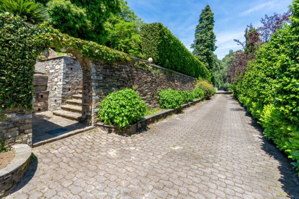 Der Zugang zum Grundstück erfolgt über eine malerische, seitlich bepflanzte Allee, die zur Villa führt. Am Ende dieses Weges befindet sich eine majestätische, jahrhundertealte Hängebuche.
