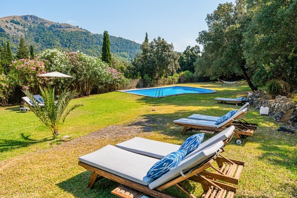 Der Außenbereich dieses schönen Landhauses ist sehr gepflegt und bietet einen Pool (12 x 4,8 m) mit Beleuchtung, umgeben von Rasen und komplett geschlossenem Garten mit altem Baumbestand.
