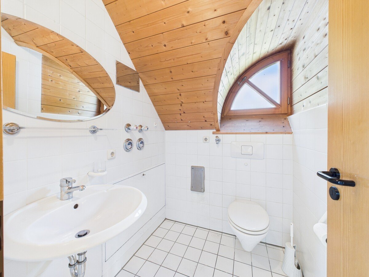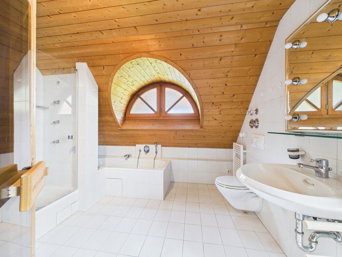 Über die offene Holztreppe gelangen Sie zur Empore im Spitzbodenbereich, wo ein weiteres Badezimmer mit Dusche, ein Ankleidezimmer und eine zusätzlicher Raum auf Sie warten – ideal für Gäste, Office oder Hobby.